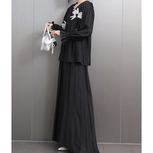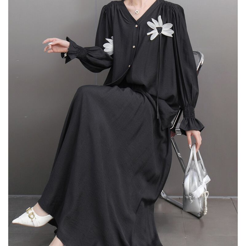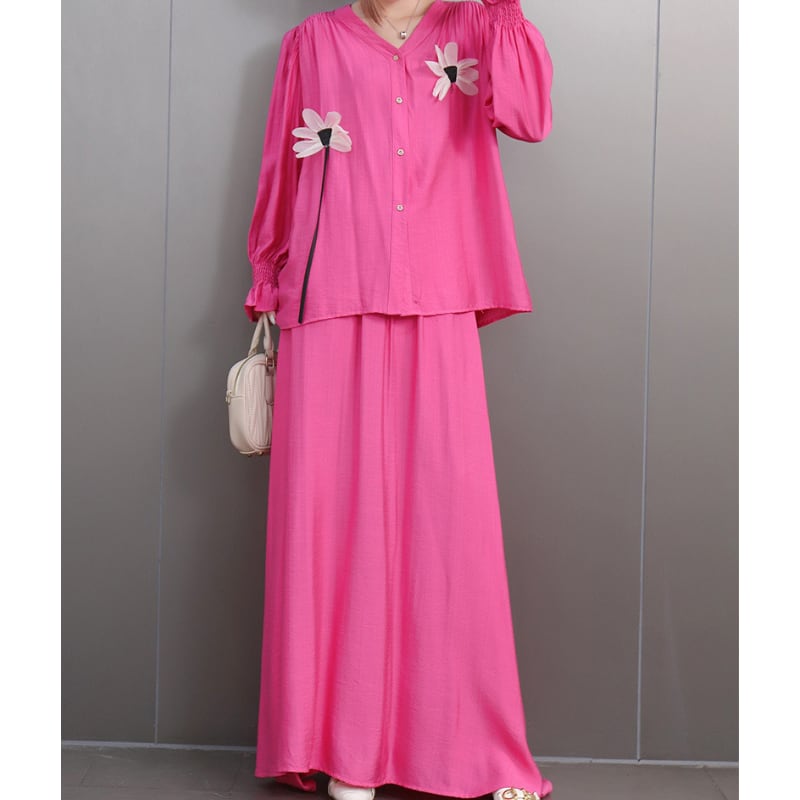 上品な花のアップリケがアクセントになったVネックセットアップ。ふんわりとしたパフスリーブのブラウスとマキシスカートの組み合わせで、女性らしさを引き立てる一着。ビビッドピンク、ブラウン、ブラックの3色展開で、シーンや好みに合わせて選べるバリエーション。