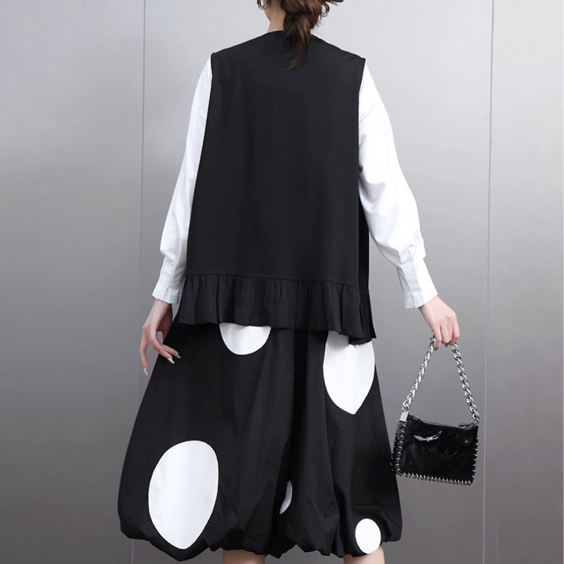 モノトーンの大胆な水玉模様が目を引くスリーピースセット。フリル付きのベスト、バルーンシルエットのスカート、白シャツの組み合わせがモダンでキュートな印象を演出。コントラスト鮮やかな白黒デザインは、シンプルながらも存在感抜群。