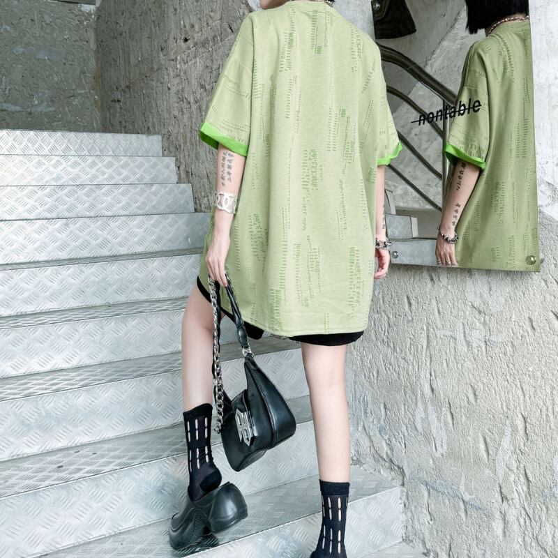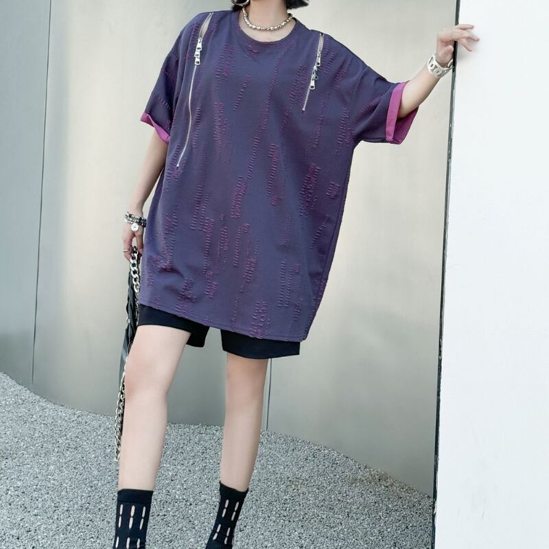 トレンドのオーバーサイズシルエットが特徴的なデザインTシャツ。表面の独特なカットワーク模様とサイドのジップディテールがアクセントに。配色された袖口が爽やかな印象を与えます。グリーン、パープルの2色展開。ショートパンツやスキニーデニムと合わせたストリートコーデにぴったり。