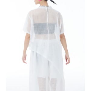 アシンメトリーな裾のデザインが、シンプルながらも個性を演出します。