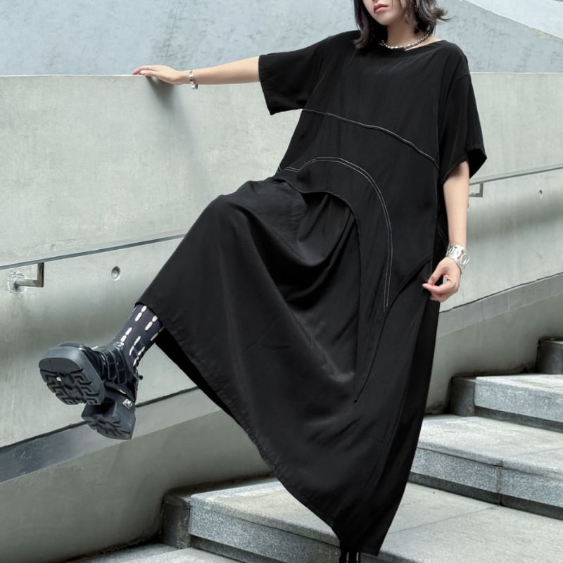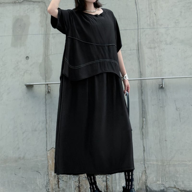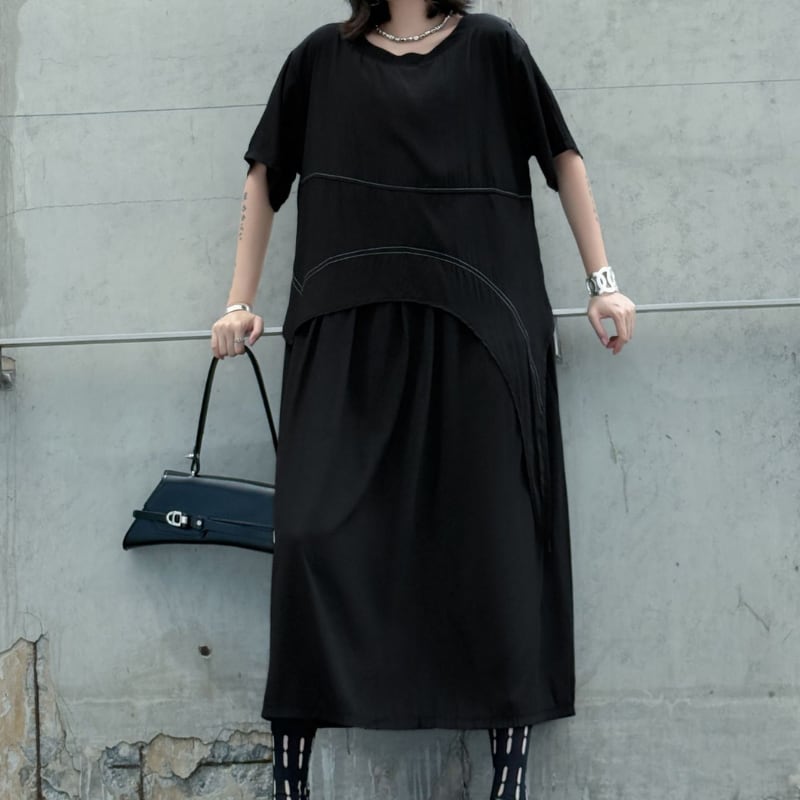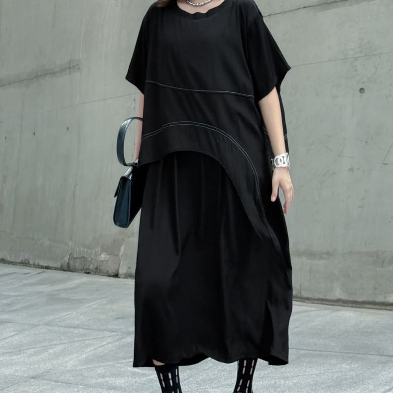 アシンメトリーデザイン Aラインシルエット ボートネック 半袖 ドッキングワンピース 1color ON0921