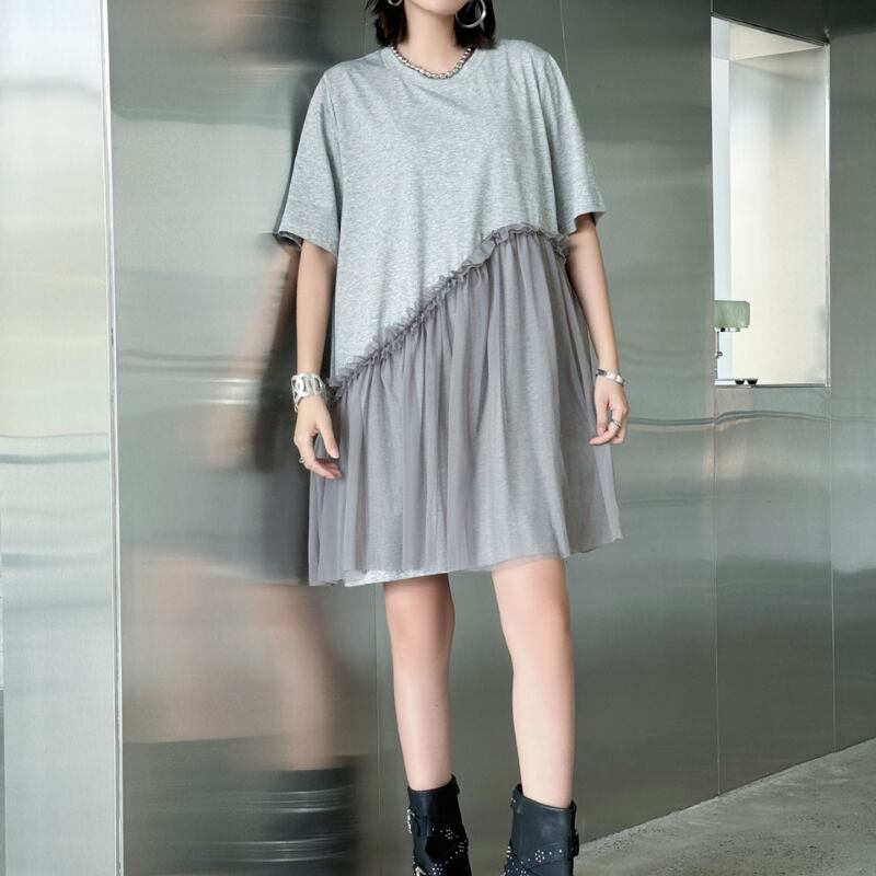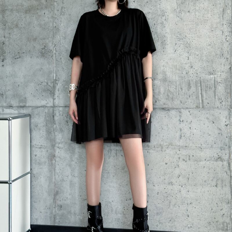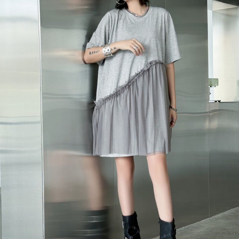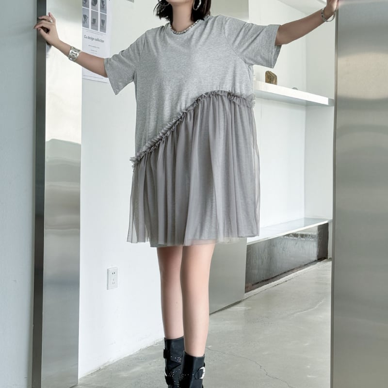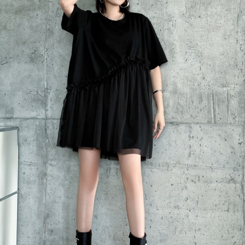 チュールレイヤードデザイン Aラインシルエット 半袖ミニワンピース 2color ON0929