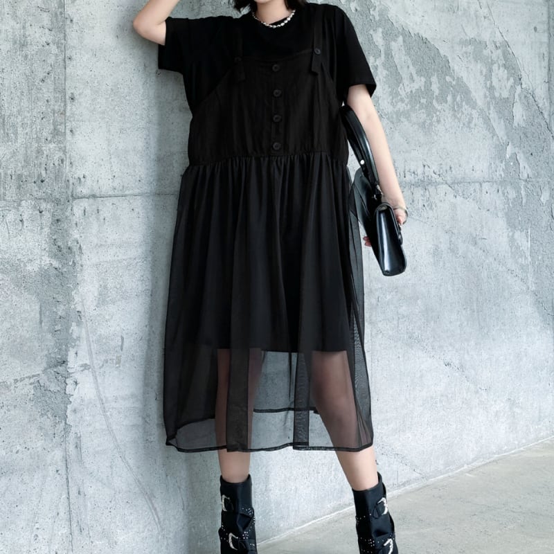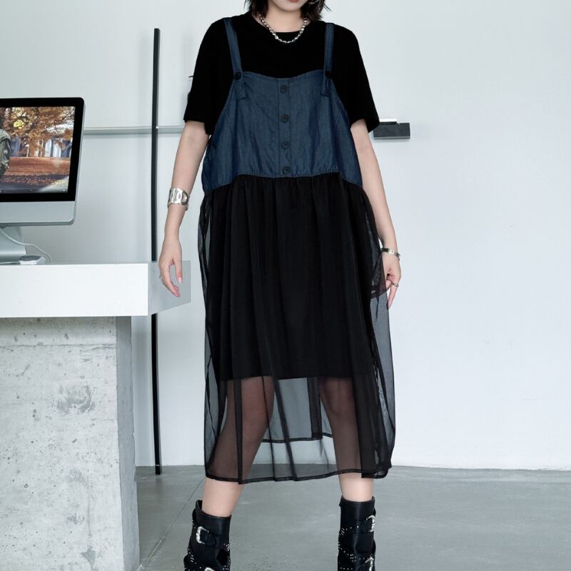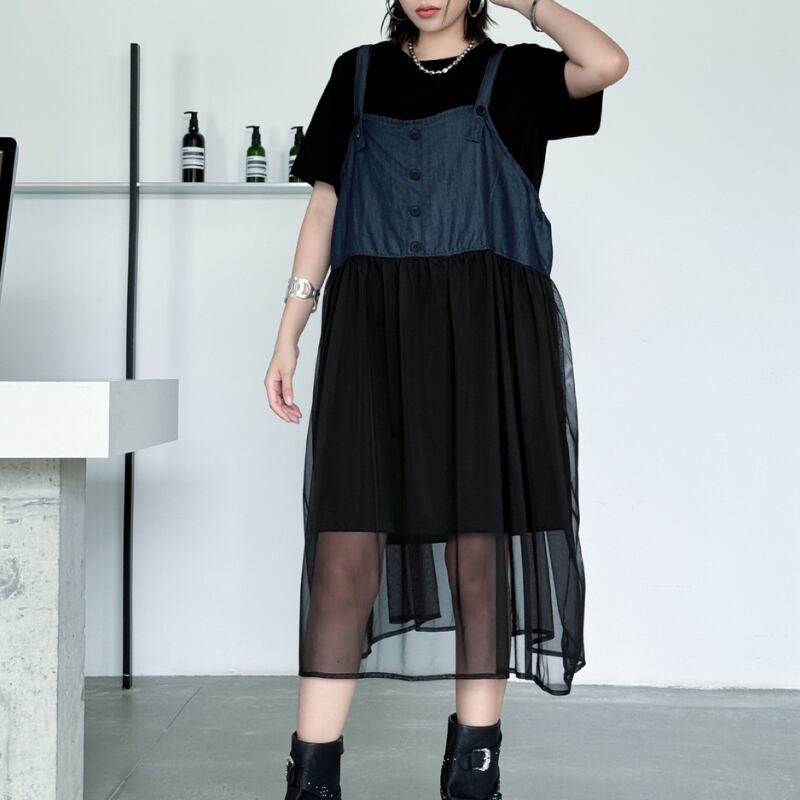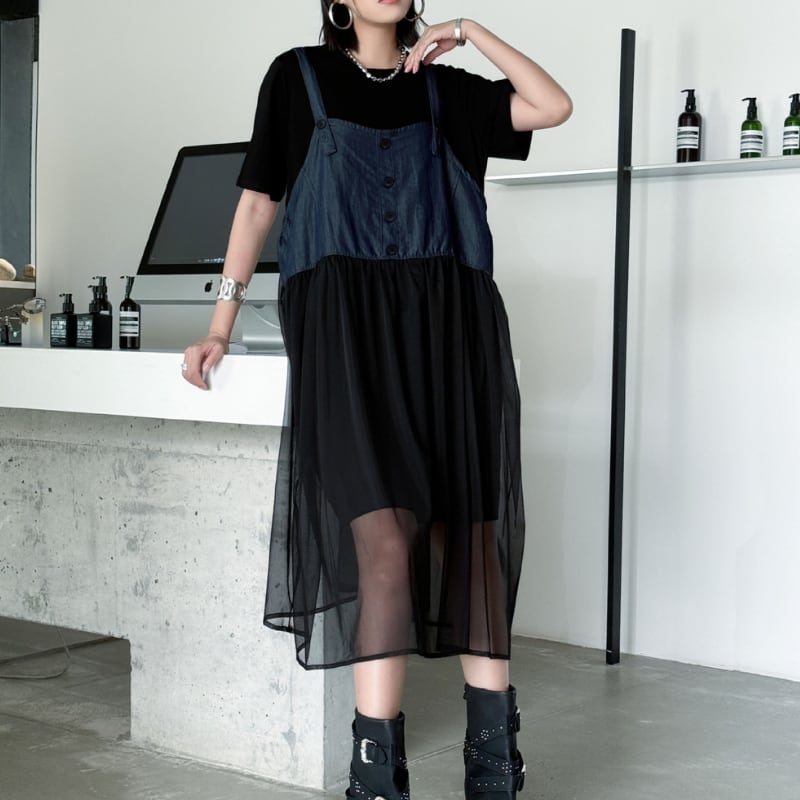 キャミソールワンピースは、デニム風のトップスとシースルー素材の組み合わせが、シンプルながらも個性を演出。レイヤードスタイルにもおすすめです。