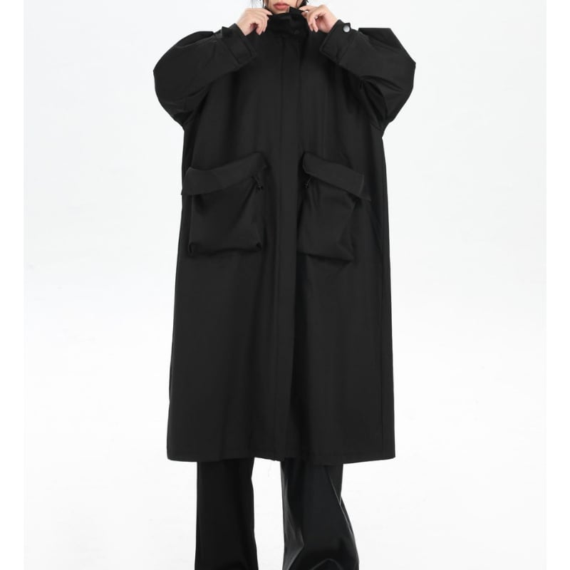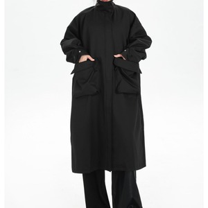 スタンドカラーのロング丈コート。Aラインシルエットが、体型をカバーしながら洗練された印象を与えます。大きなパッチポケットがアクセントとなり、実用性も兼ね備えたデザインです。普段使いはもちろん、ちょっとしたお出かけにも活躍する一枚です。