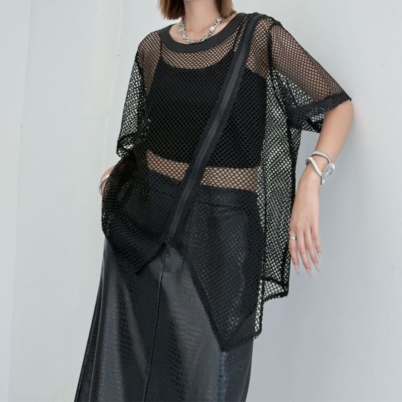 メッシュ素材のオーバーサイズクルーネックTシャツ。ゆったりとしたシルエットが、リラックス感とモード感を同時に演出します。サイドのジッパーがデザインのアクセントとなり、個性を際立たせます。様々なスタイリングに合わせやすく、デイリーユースから特別な日のコーディネートまで幅広く活躍します。