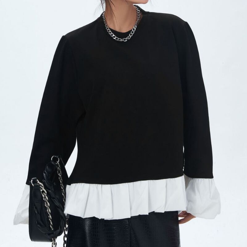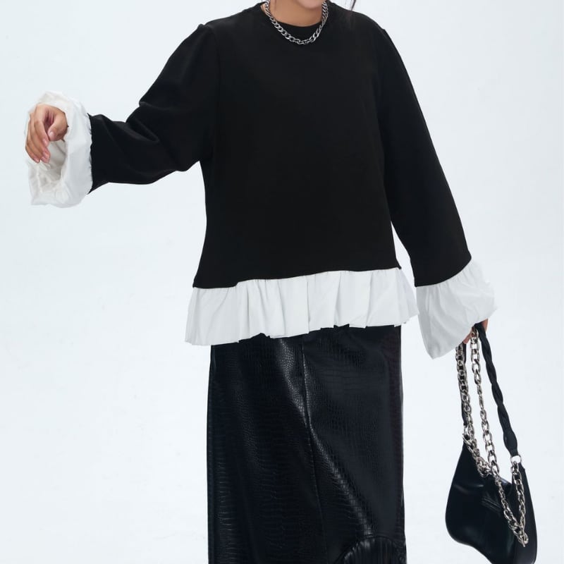 ラウンドネック 切り替えデザイン ティアードブラウス, 1color PU0415