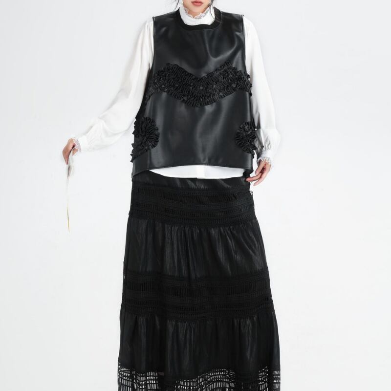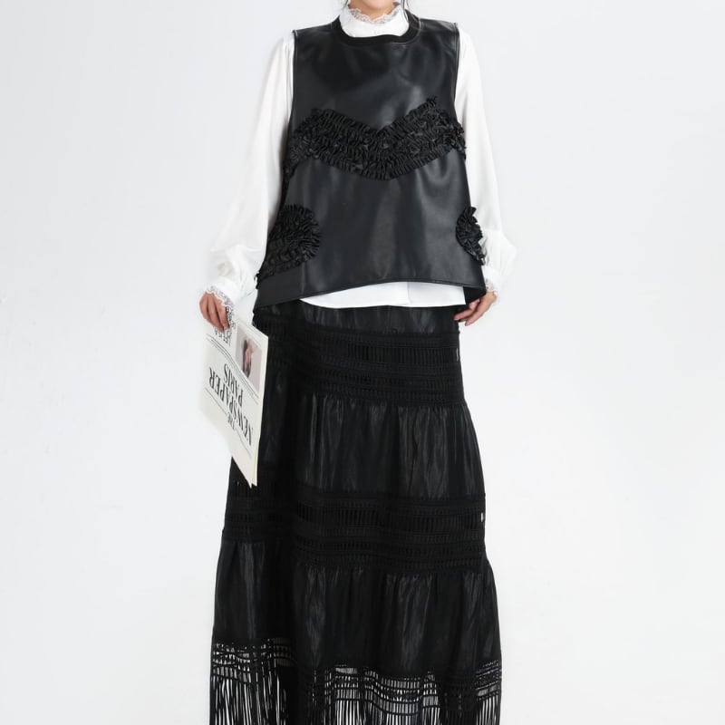 フェイクレザーのノースリーブトップス。ラウンドネックとフリル装飾が、シンプルながらも洗練されたデザインを演出します。一枚で着こなせる存在感で、様々なスタイリングに活躍します。