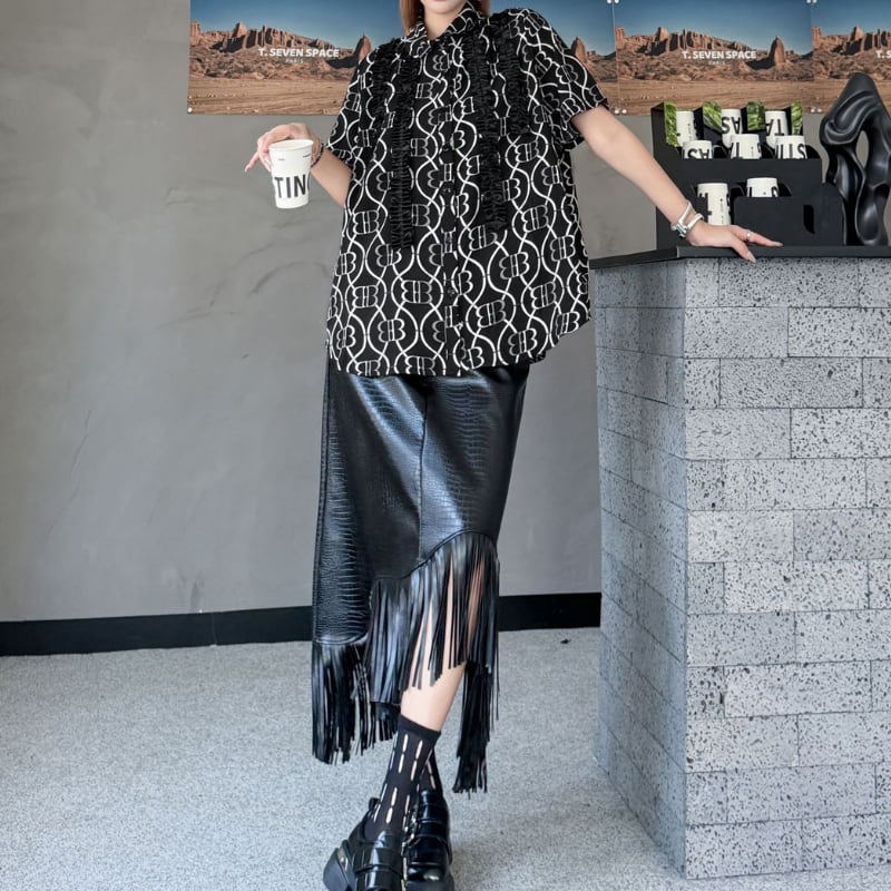 幾何学模様が目を引くバンドカラー半袖シャツ。モノトーンの洗練されたデザインは、様々なスタイルに合わせやすく、デイリーユースに最適です。フロントのフリルディテールが、さりげないアクセントになっています。