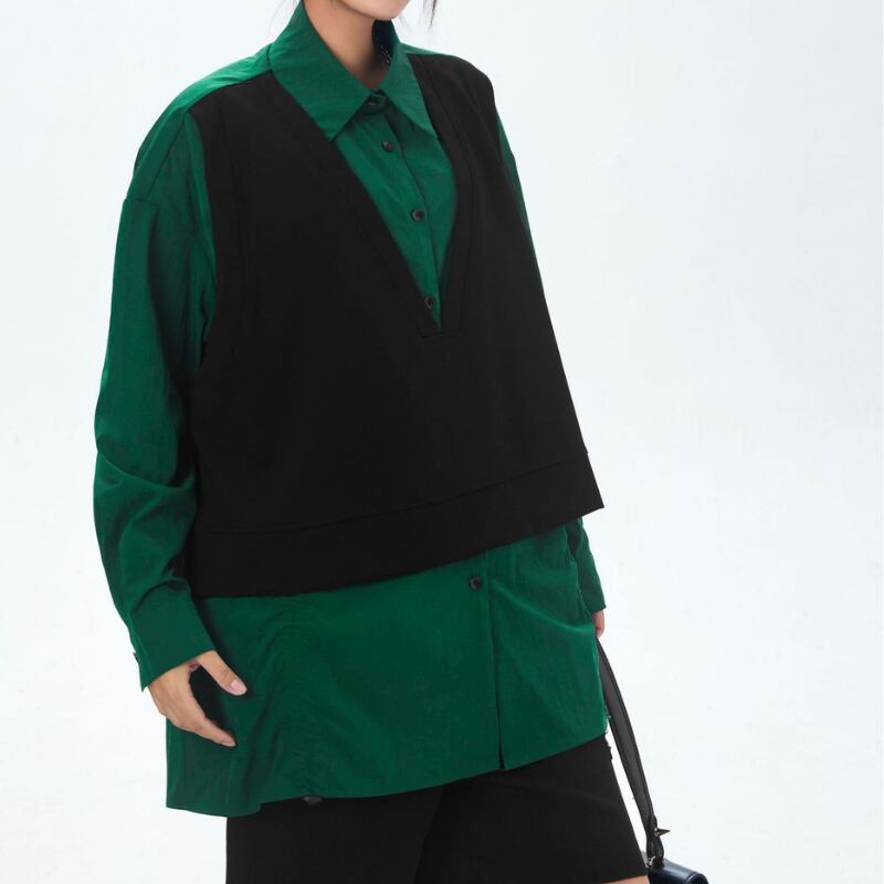 クロップド丈のVネックベストの重ね着風デザインのシャツで着こなしに奥行きをプラス。シンプルながらも洗練されたシルエットが、様々なスタイリングに合わせやすく、着回し力抜群です。一枚でこなれ感を演出できる、便利なアイテムです。