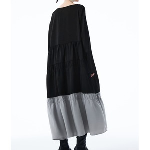 クルーネックの長袖とティアードスカートが上品なロング丈ワンピース。ブラックとグレーのツートーンカラーが、シンプルながらも洗練された印象を与えます。一枚で着映えするデザインは、デイリーユースからちょっとしたお出かけまで幅広いシーンで活躍します。