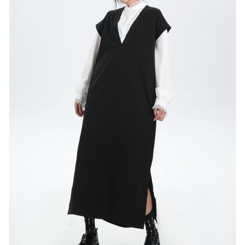 Vネック サイドスリット入り マキシ丈ノースリーブワンピース 1color ON0955