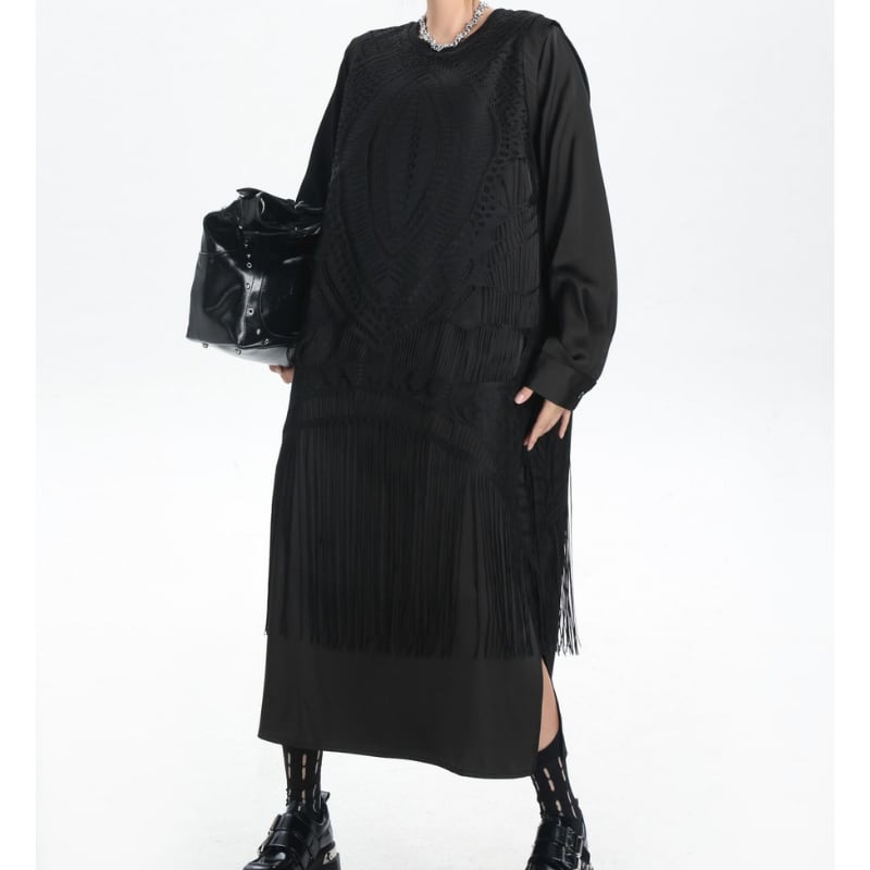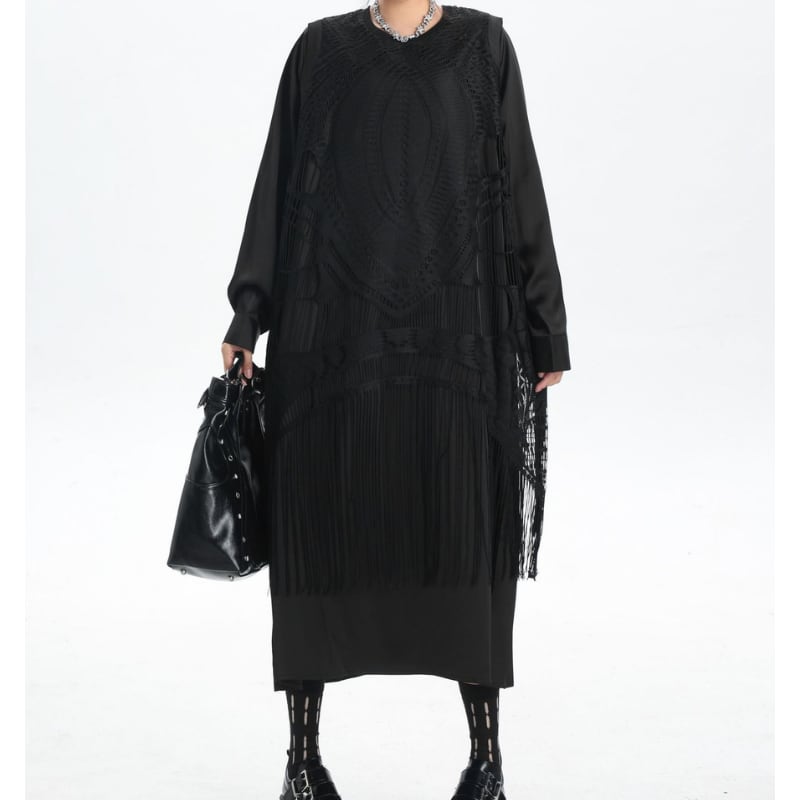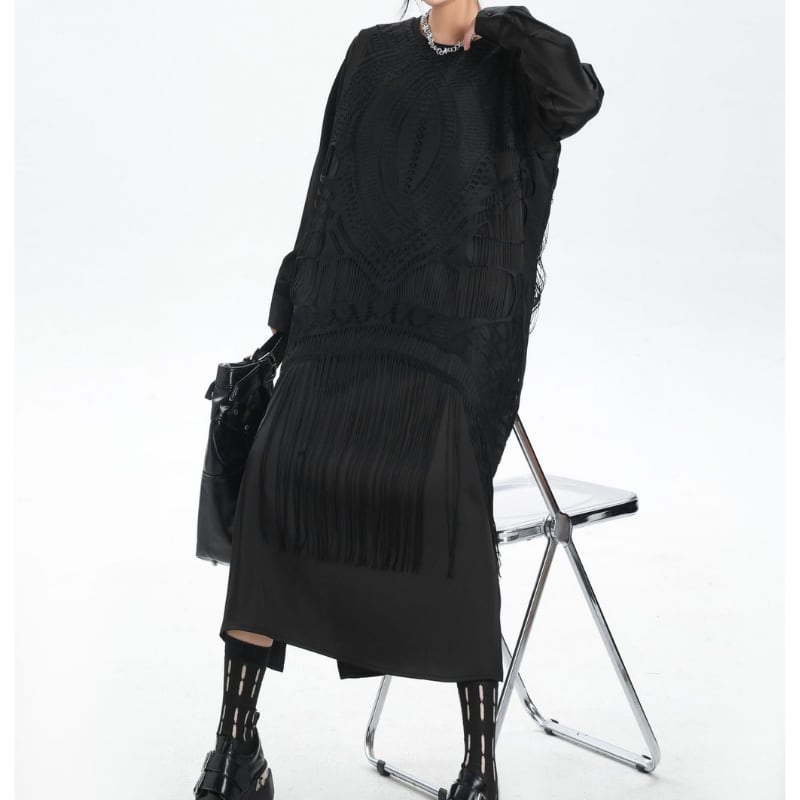 レイヤード風のデザインが洗練されたロングスリーブトップス。オーバーサイズシルエットでリラックスした着心地ながら、繊細なレーストリムと裾のフリンジが、モードで個性的なスタイルを演出します。普段使いからちょっとしたお出かけまで、幅広いシーンで活躍する一枚です。