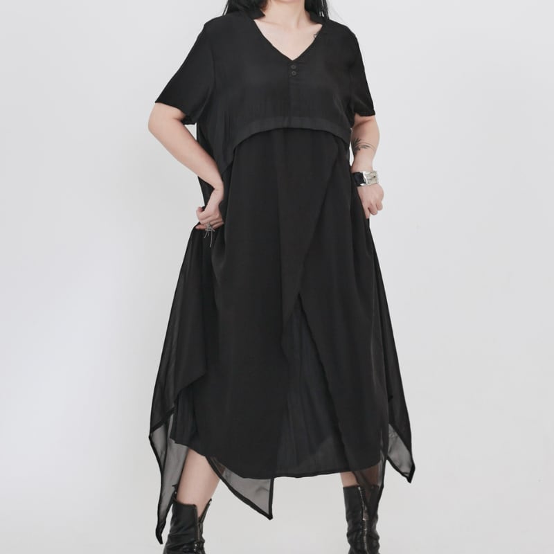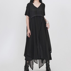 Vネックとシフォンの切り替えがポイントのワンピース。シンプルなデザインながら、裾のアシンメトリーなシルエットがモードな雰囲気を演出します。一枚でスタイリッシュな着こなしが完成する、デイリーユースに最適なアイテムです。