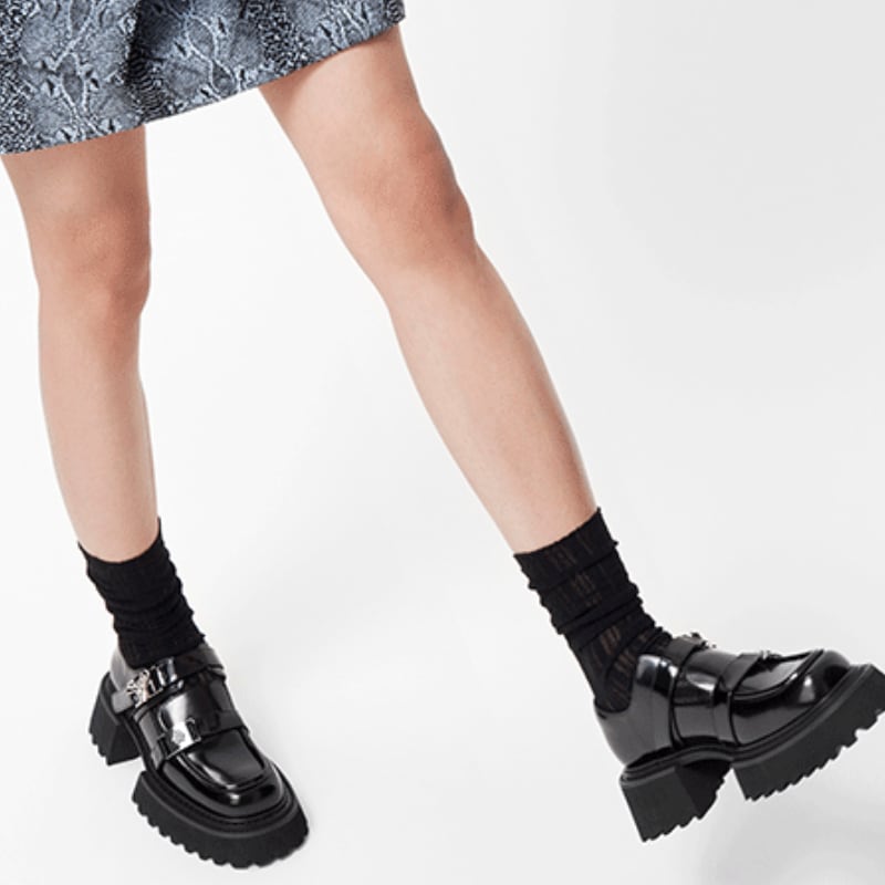 厚底プラットフォームソールとダブルストラップが特徴的なローファー。モードなデザインで、足元をスタイリッシュに演出します。
