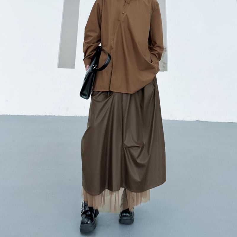 アシンメトリーなデザインが目を引くミモレ丈スカート。