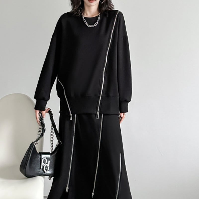 ジップデザイン 長袖 ドロップショルダー スウェット 1color PU0429