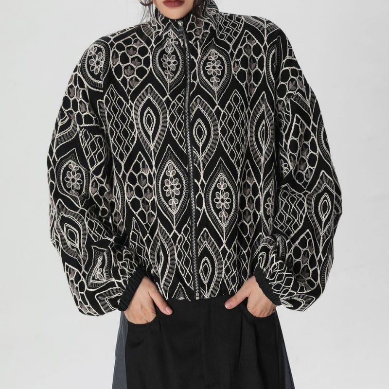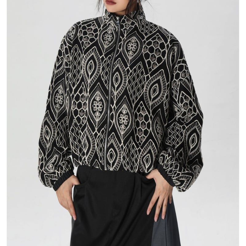目を引く幾何学模様が特徴的なジップアップブルゾン。ヒップ丈なので、スタイルアップ効果も期待できます。普段使いはもちろん、ちょっとしたお出かけにも最適な一枚です。