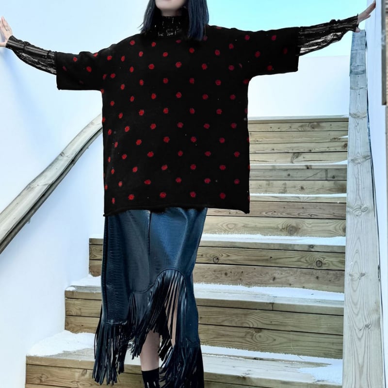 水玉模様が目を引く、五分袖のニットワンピースです。ミニ丈で、カジュアルながらも女性らしい印象を与えます。普段使いはもちろん、ちょっとしたお出かけにもおすすめです。