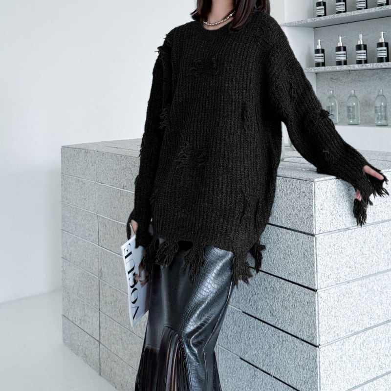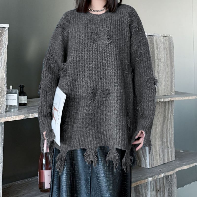 ダメージ加工 長袖 オーバーサイズ ニット 2color PU0442