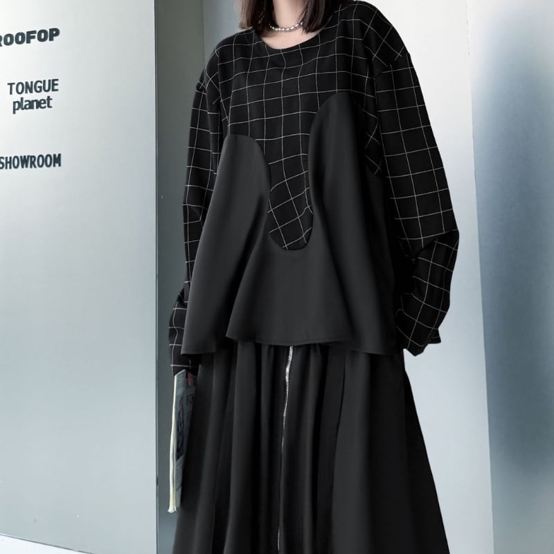モノトーンの格子柄と無地の切り替えデザインが、洗練された着こなしを演出します。