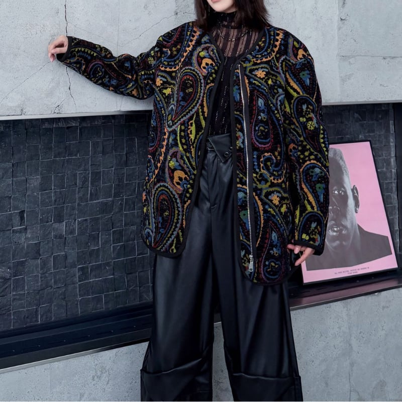 目を引くペイズリー柄が印象的なノーカラージャケット。Vネックのデザインが首元をすっきりと見せ、着こなしに抜け感をプラスします。ヒップ丈なので、様々なボトムスとの相性も抜群。普段のコーディネートに羽織るだけで、個性的なスタイルが完成します。