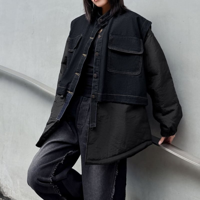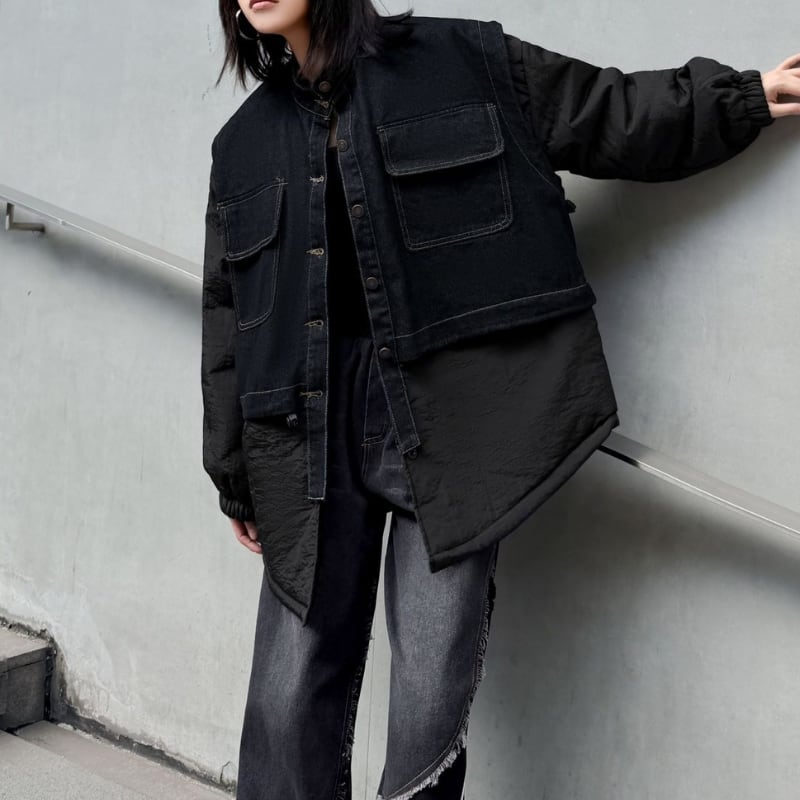 異素材の組み合わせが目を引くショート丈ジャケット。