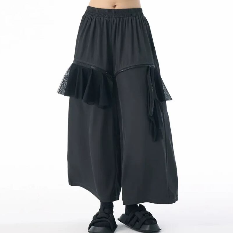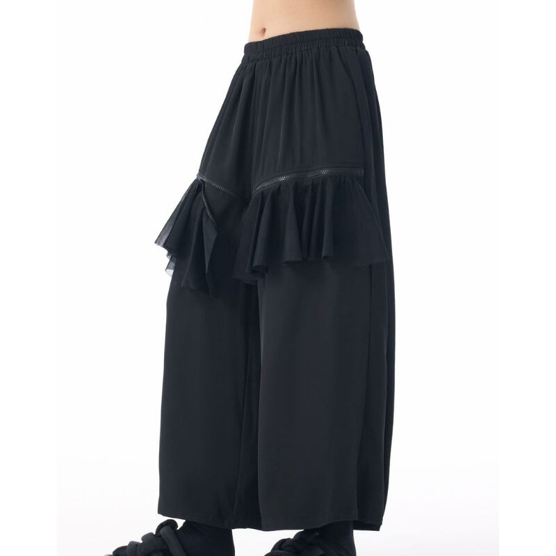 ワイドシルエットで動きやすく、トレンド感のあるキュロット丈パンツ。特徴的なジッパー装飾が、シンプルな着こなしにアクセントを加えます。普段使いはもちろん、少しエッジの効いたコーディネートにもおすすめです。