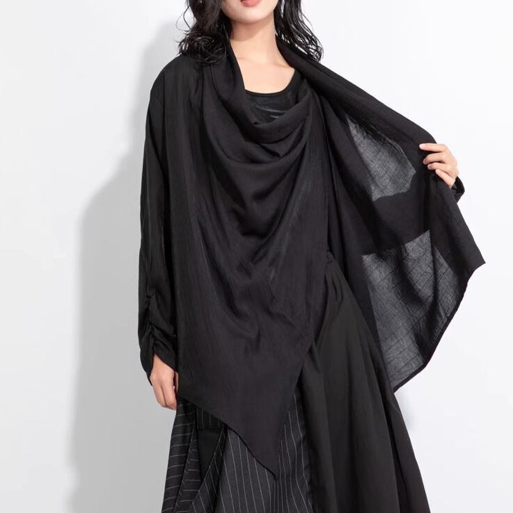アシンメトリーなデザインが目を引く、ラップ風の長袖ジャケット。