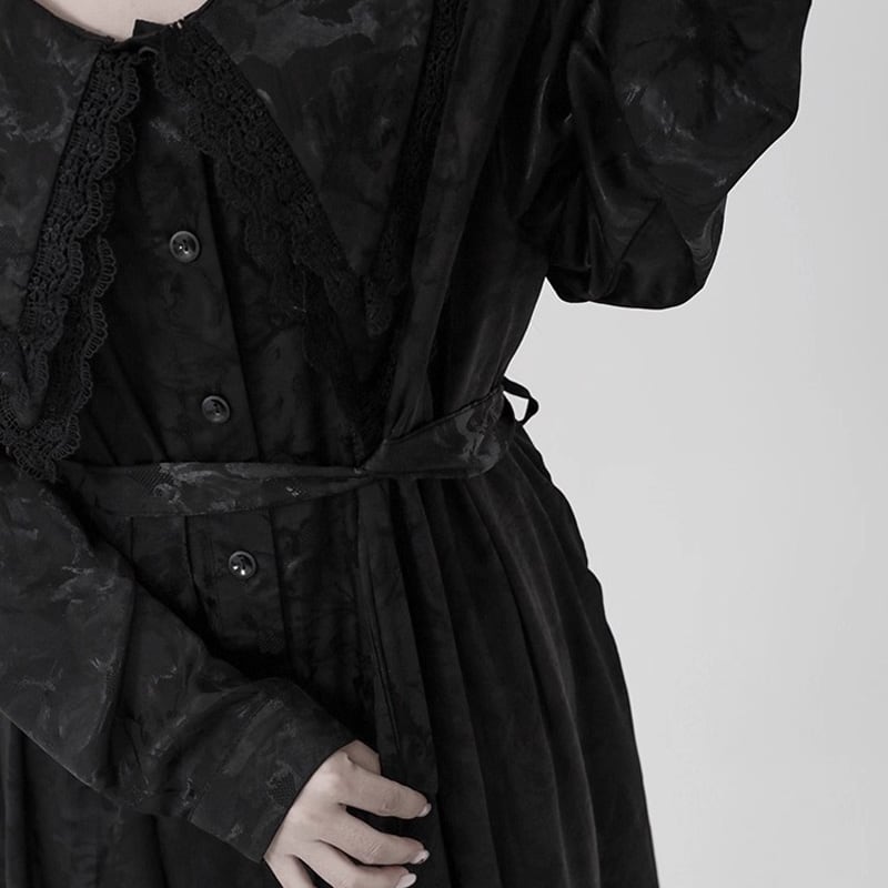 襟レース マキシ丈 長袖 総柄ワンピース 1color ON0987