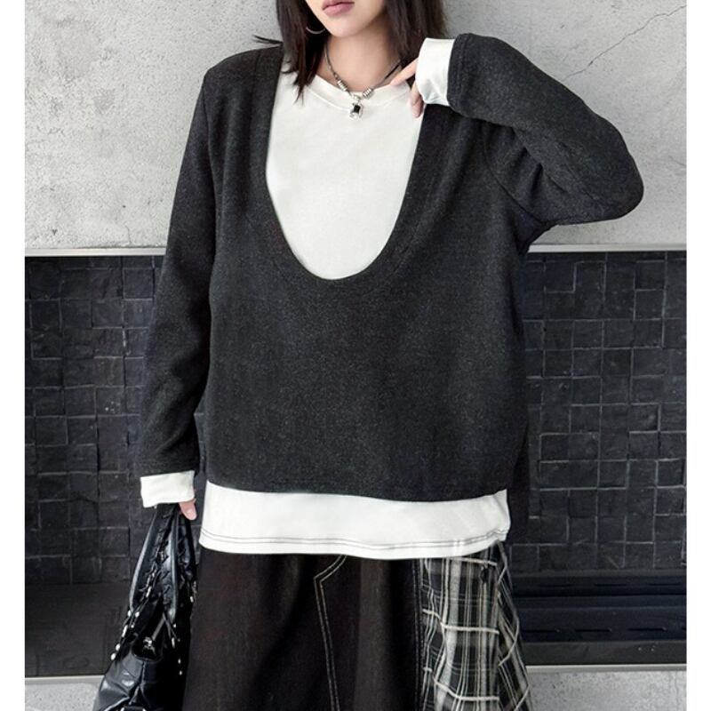 長袖 Uネック ドッキング デザイン スウェット 1color PU0469