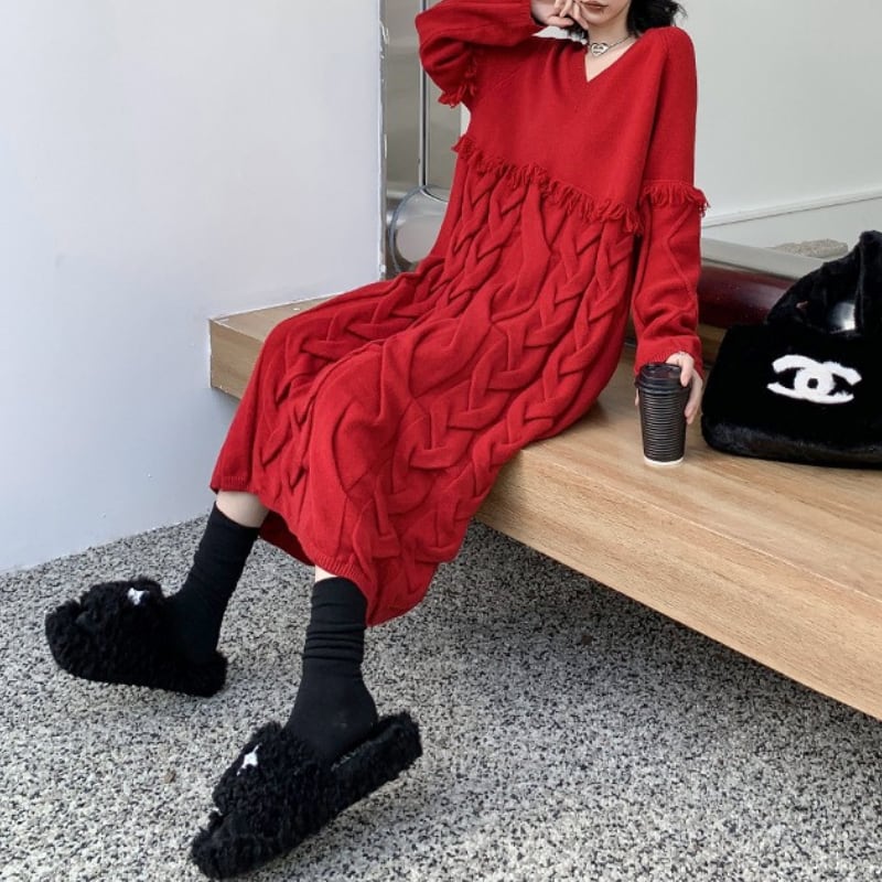 フリンジ付き ミモレ丈 ニット ワンピース 2color ON0993