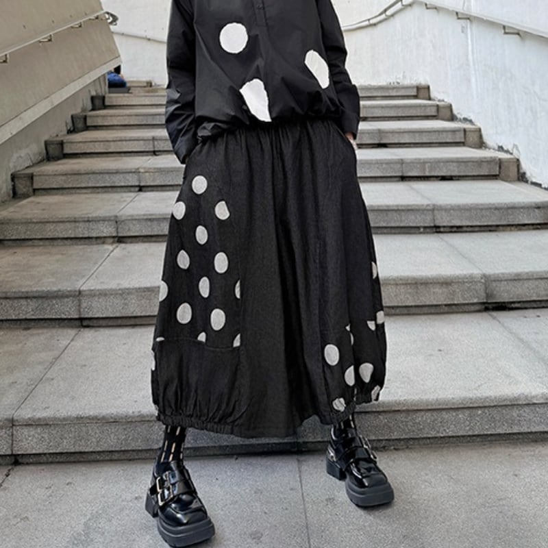 ドット柄がコーディネートのアクセントとなり、個性的なスタイルを演出します。