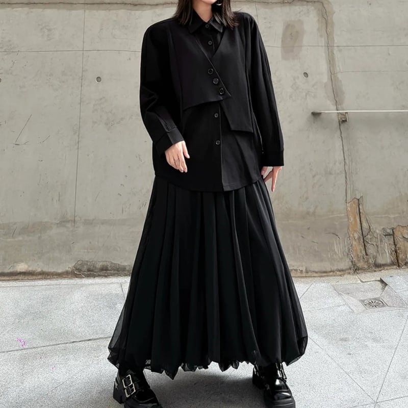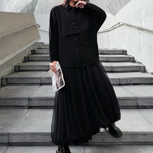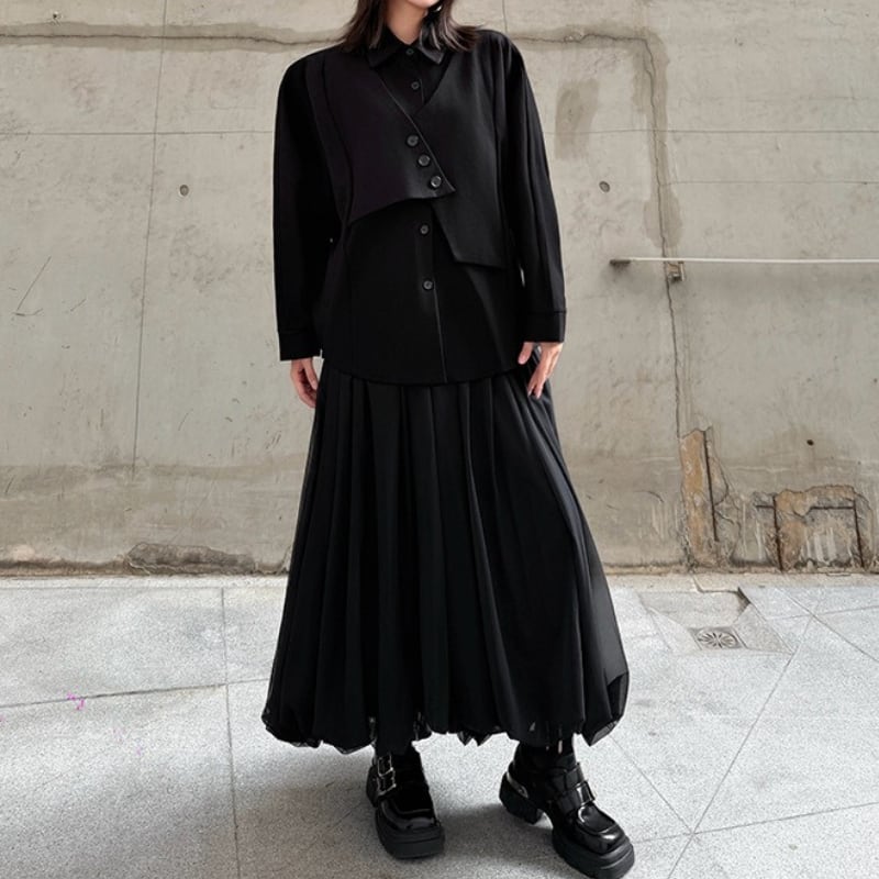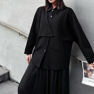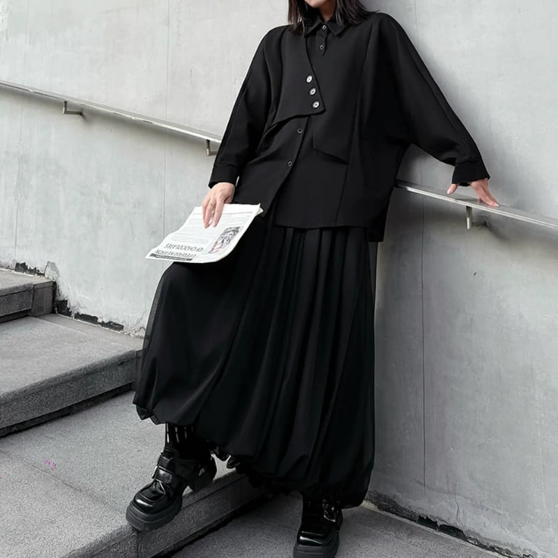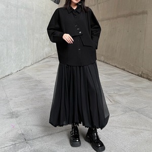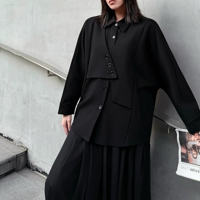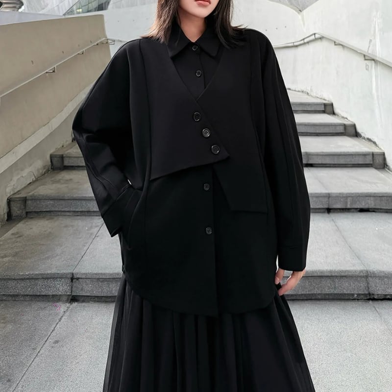 ボタンの留め方でアレンジを楽しめるアシンメトリーなデザインが、モードな雰囲気を演出します。