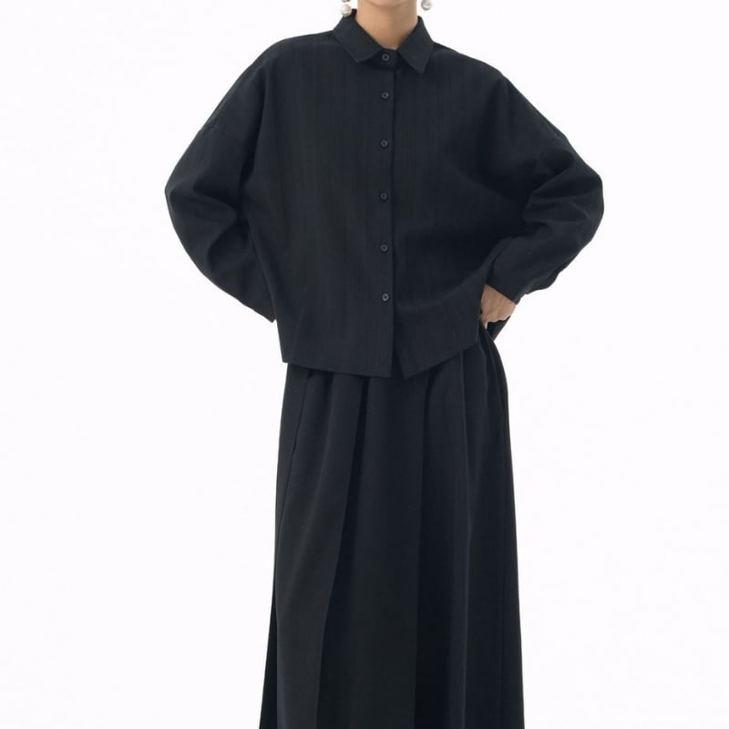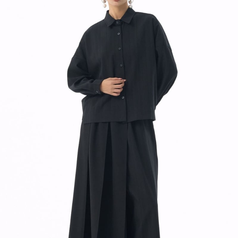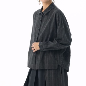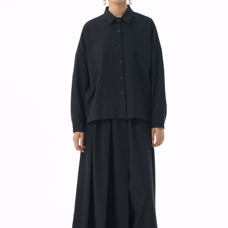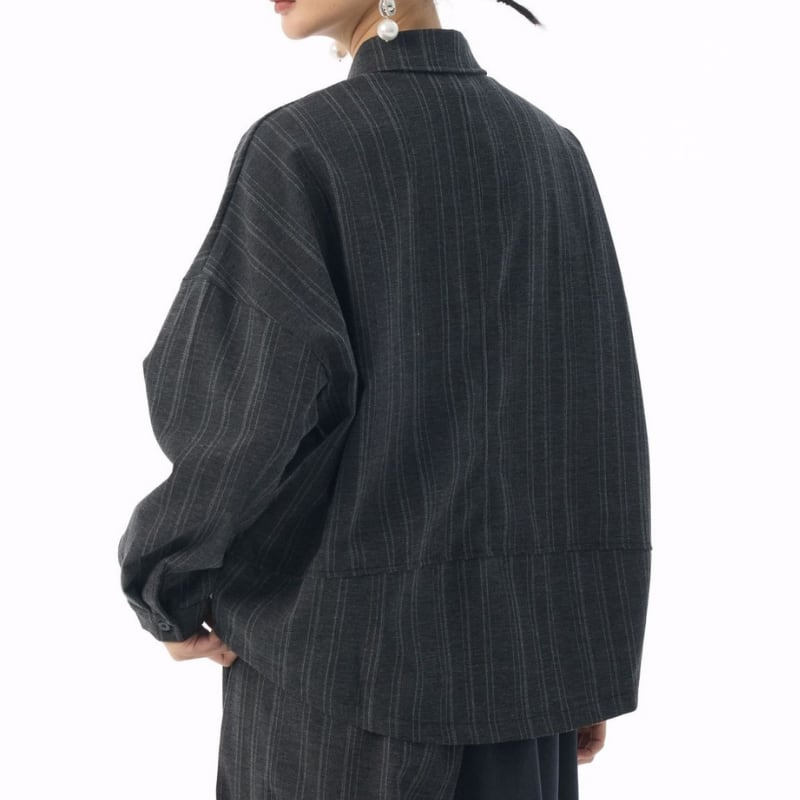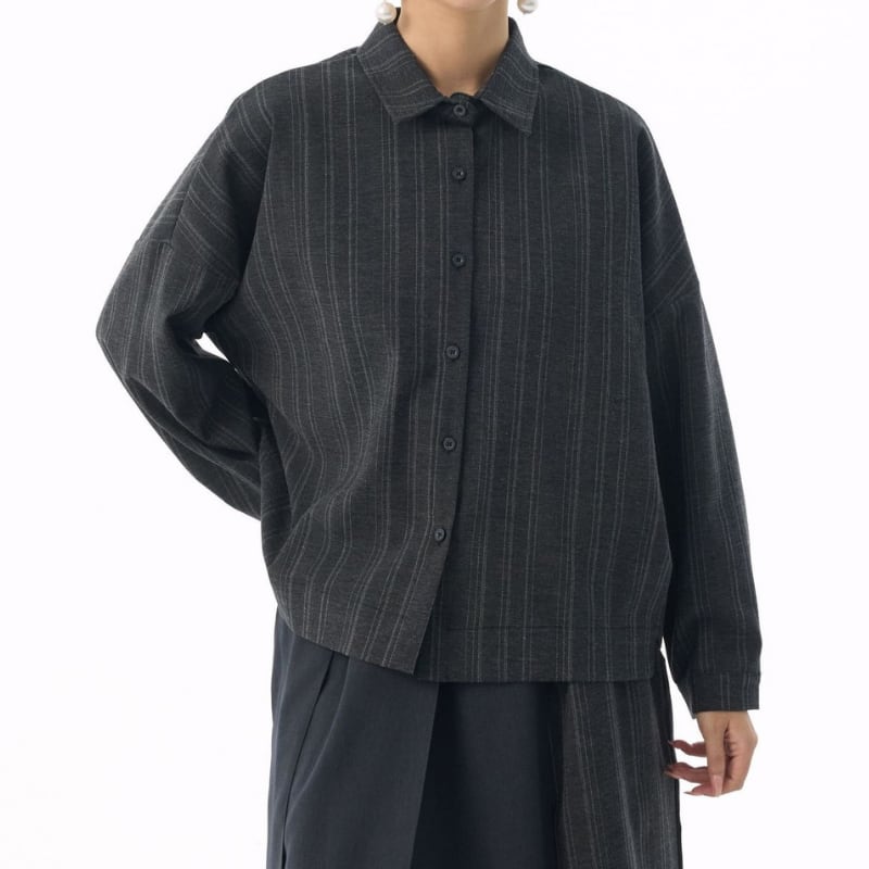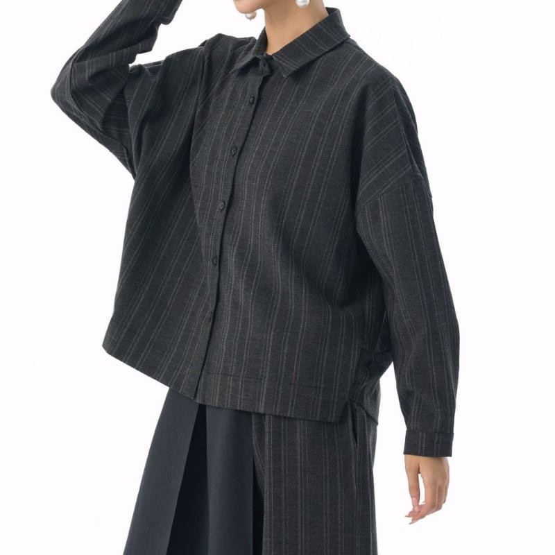 ゆったりとしたオーバーサイズのシャツ。ストライプ柄が、落ち着いた雰囲気の中にスタイリッシュさをプラスします。