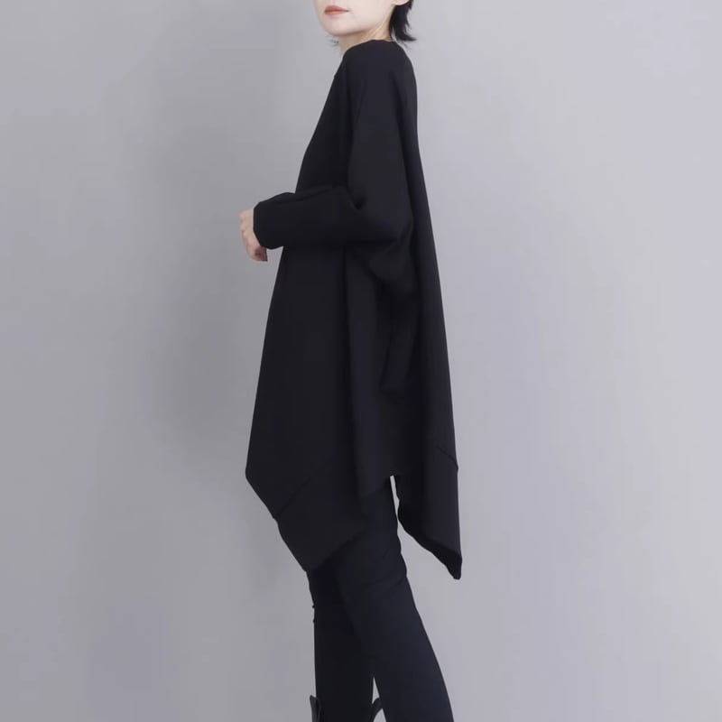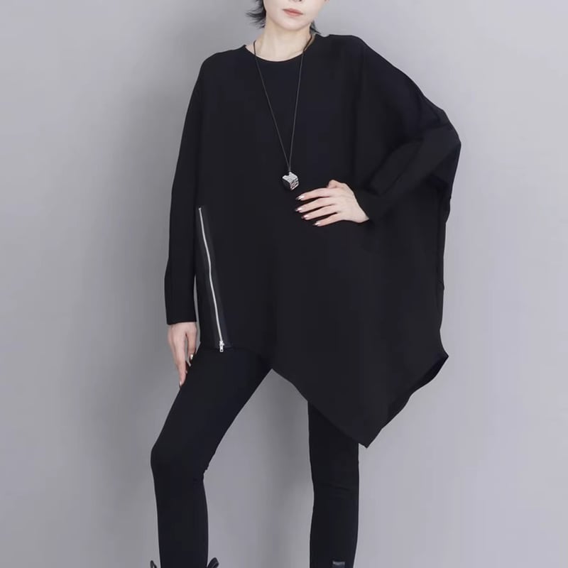 アシンメトリーな裾のラインとジップデザインが、個性的でモードな雰囲気を演出します。