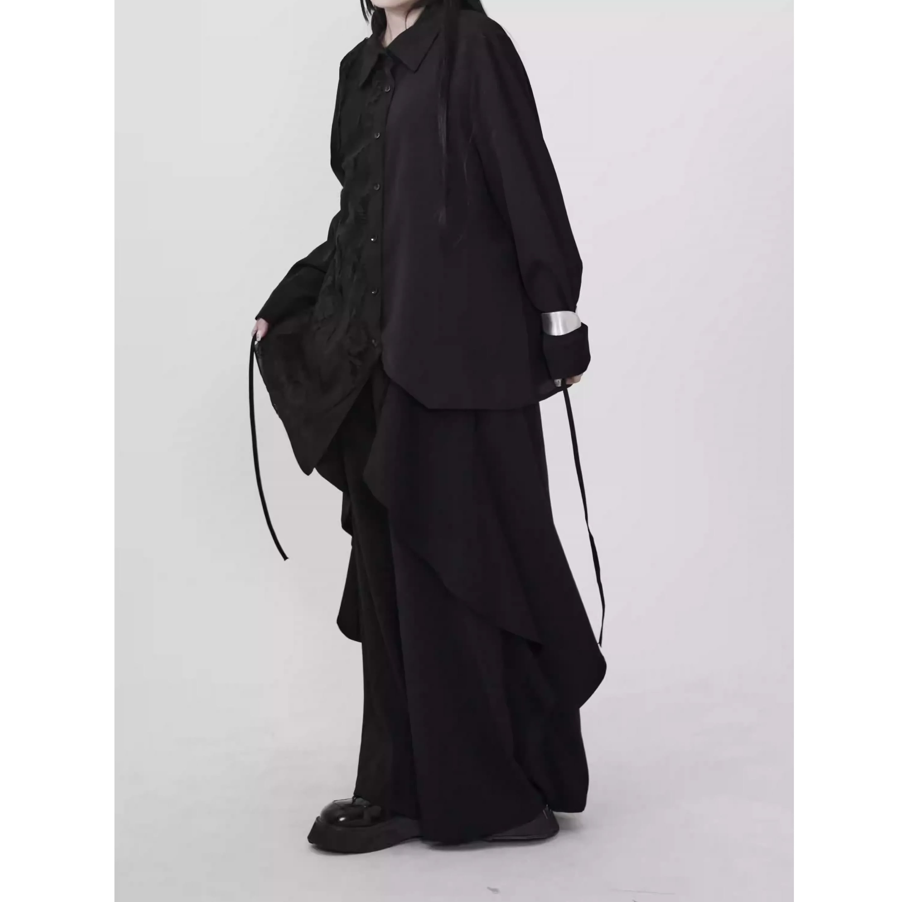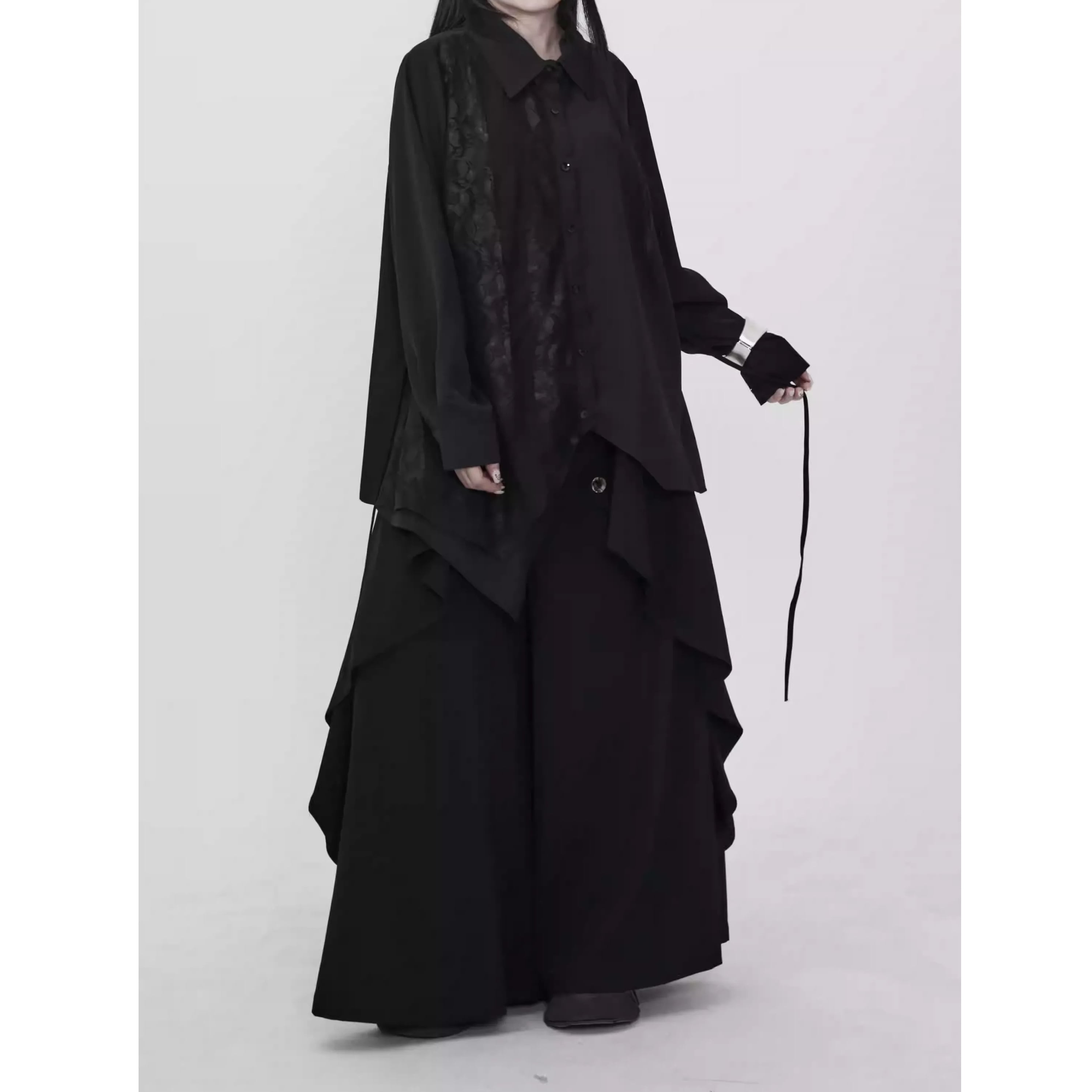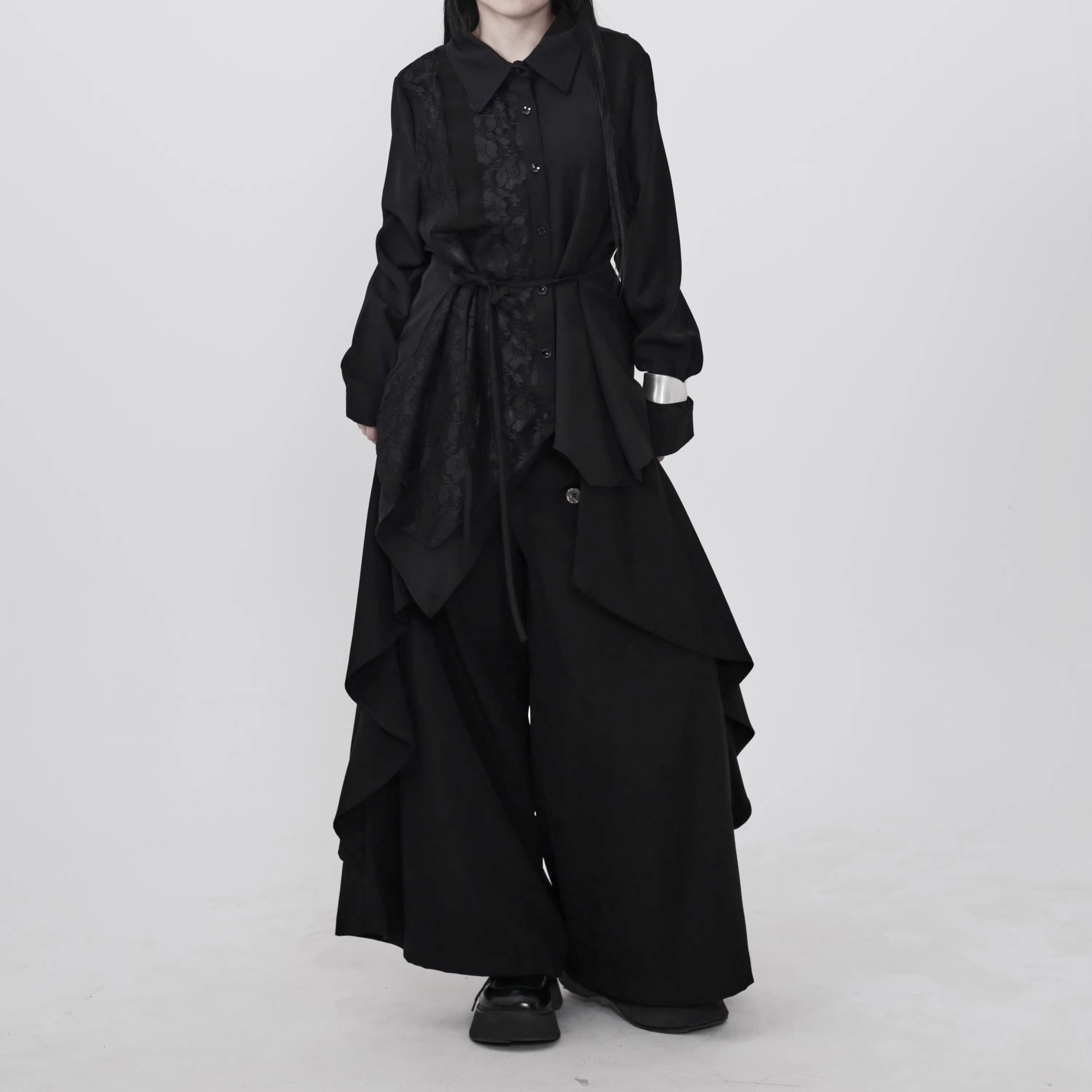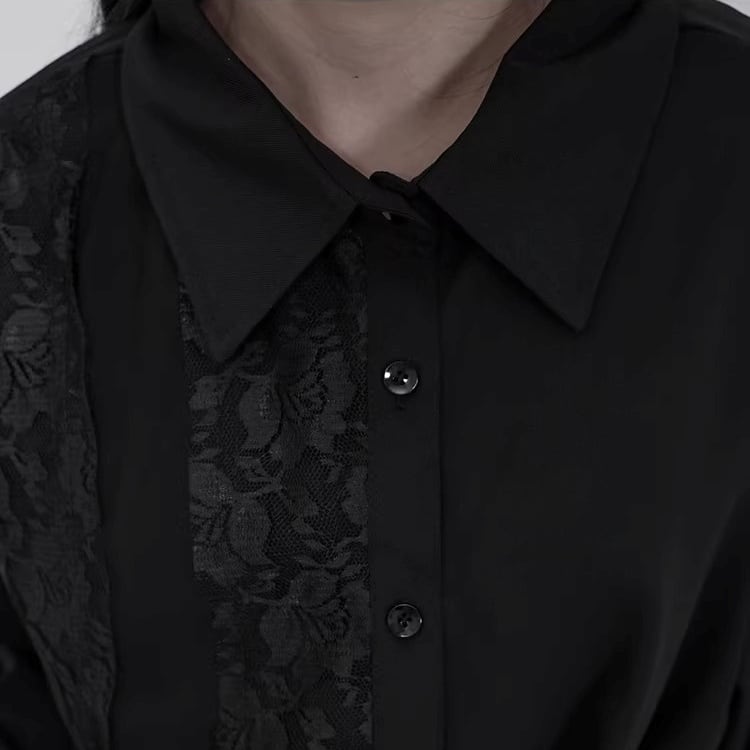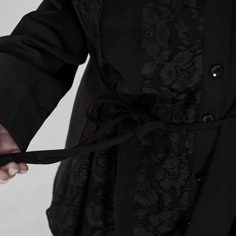 レース切替 ベルト付き 長袖 シャツ ワンピース 1color BL0588