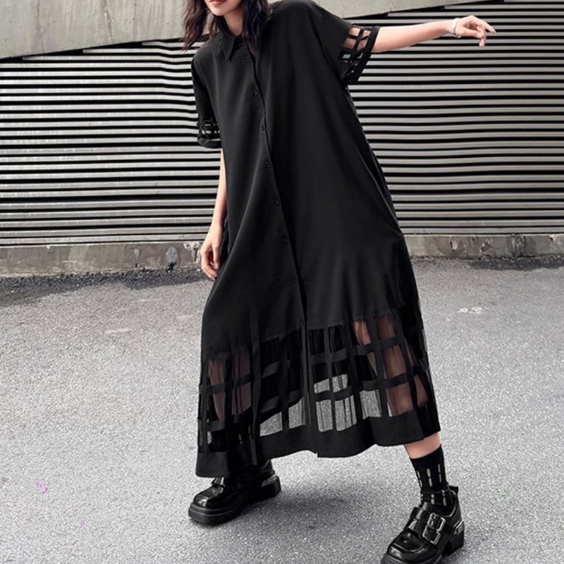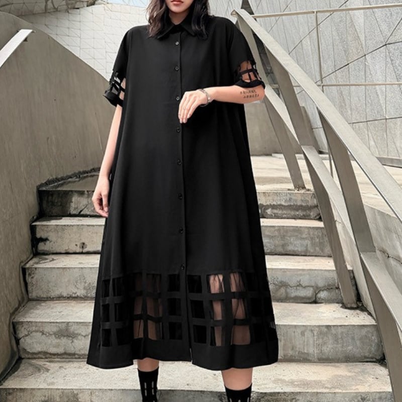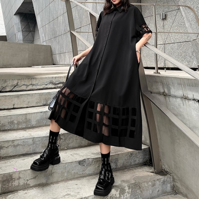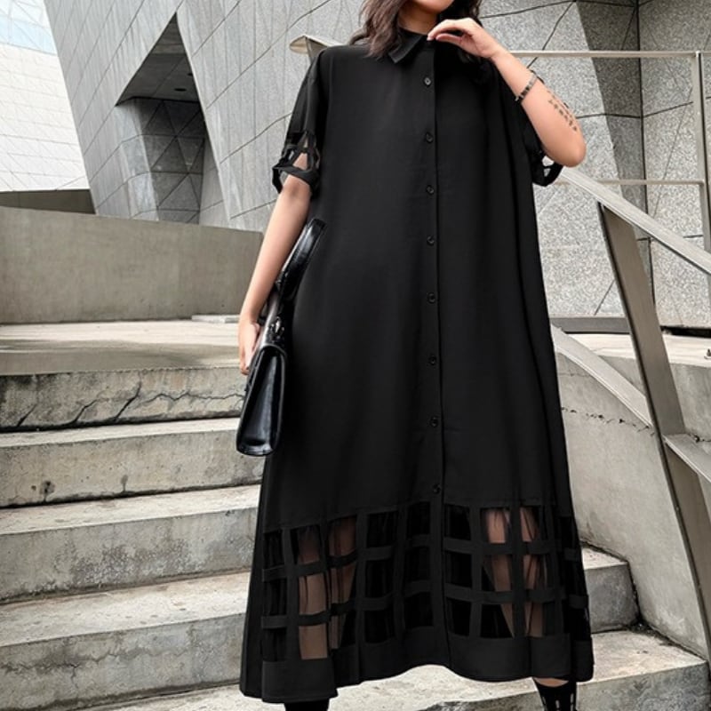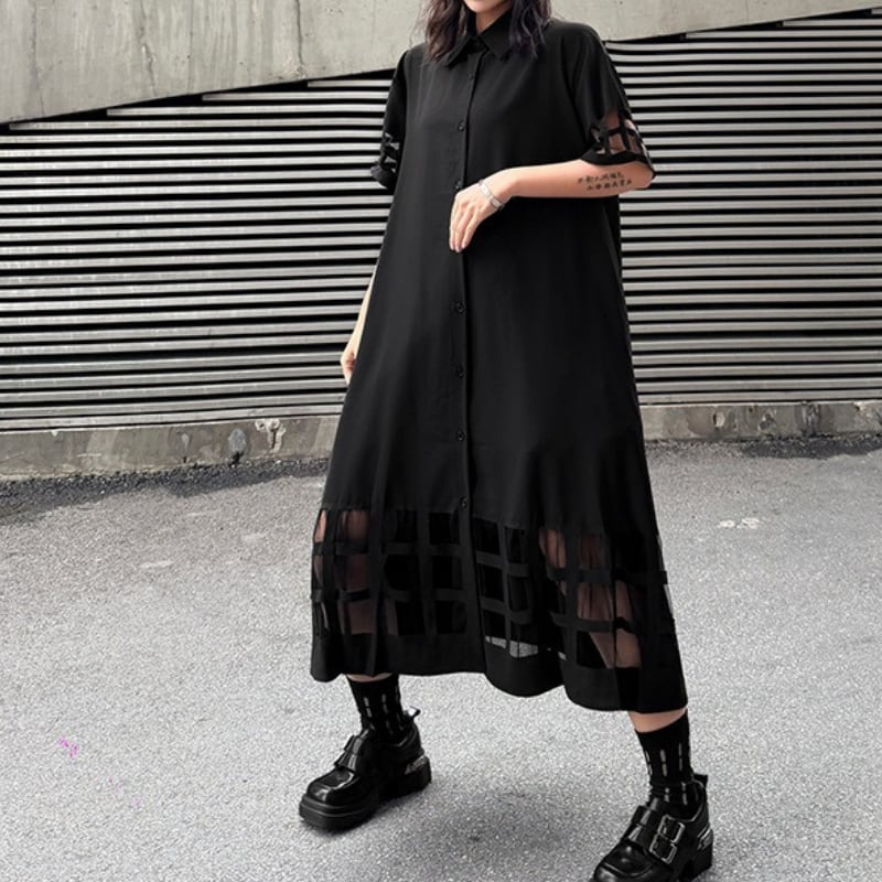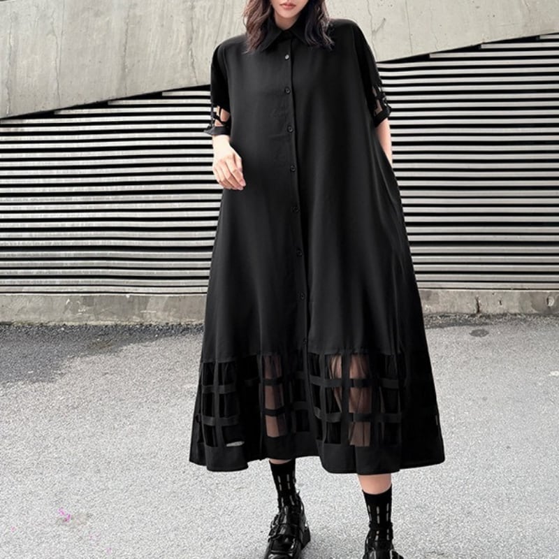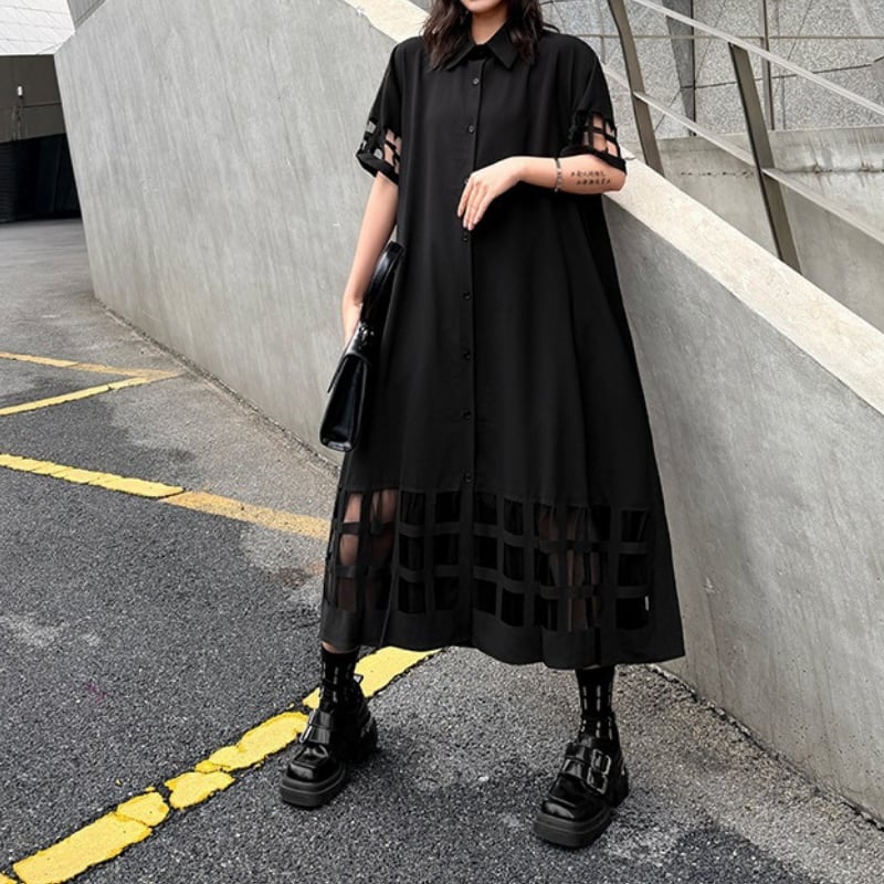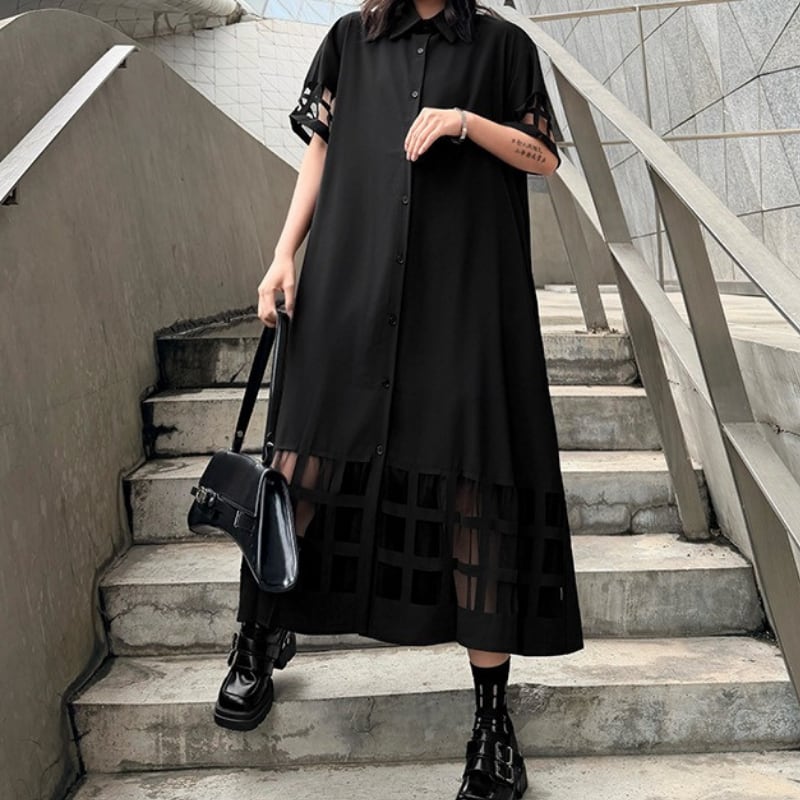 ミモレ丈で落ち着いた印象を与えつつ、袖と裾のカットアウトデザインが個性をプラス。