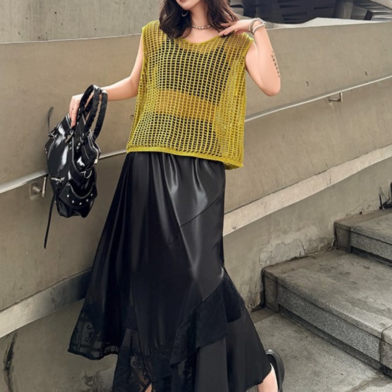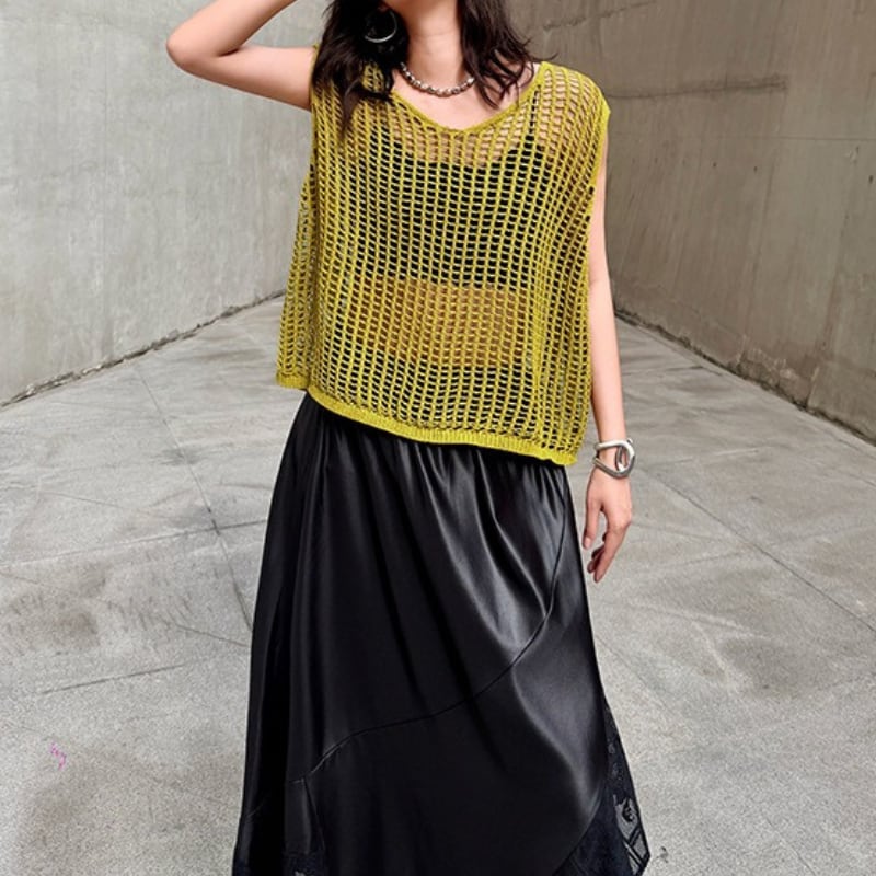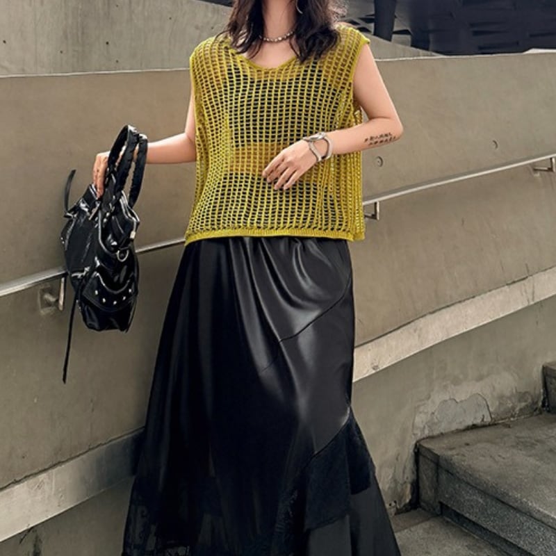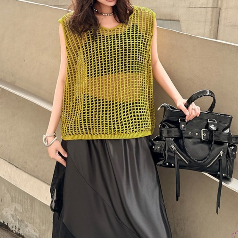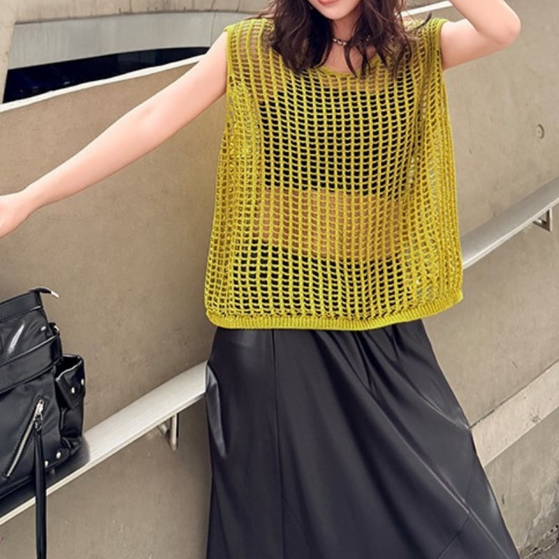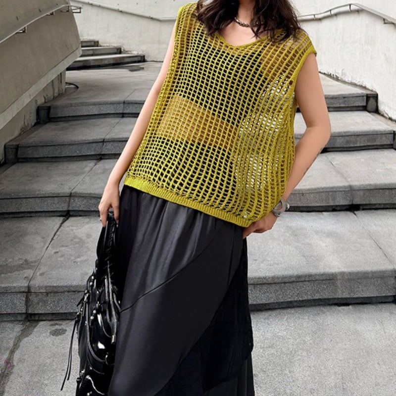 ノースリーブ スリットネック オーバーサイズ ニットトップス 2color PU0497