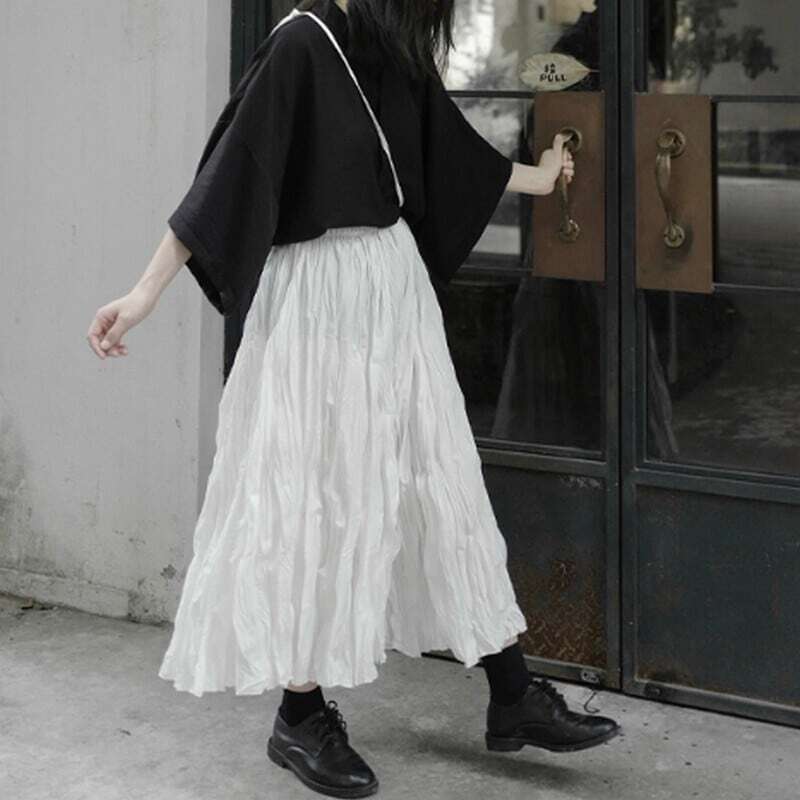 大きな袖口がゆったりした印象のシンプルコーデ。