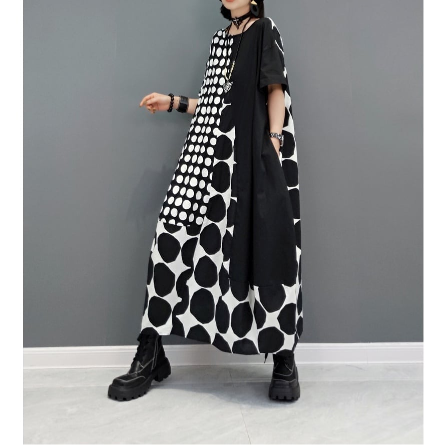 2種類の大きさのドット柄生地を組み合わせたデザインの、ラウンドネックロング丈のワンピースです。