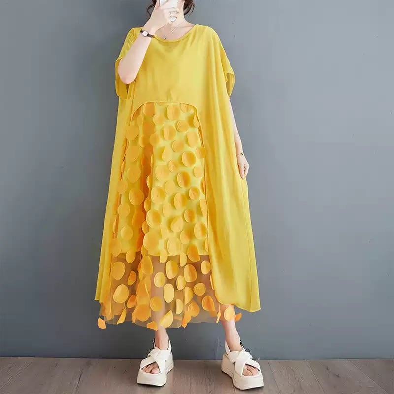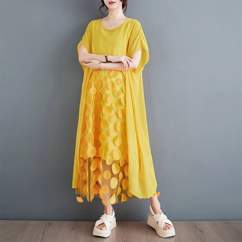 立体感のあるドット柄がワンピース全体に施されており、ユニークな印象を与えます。