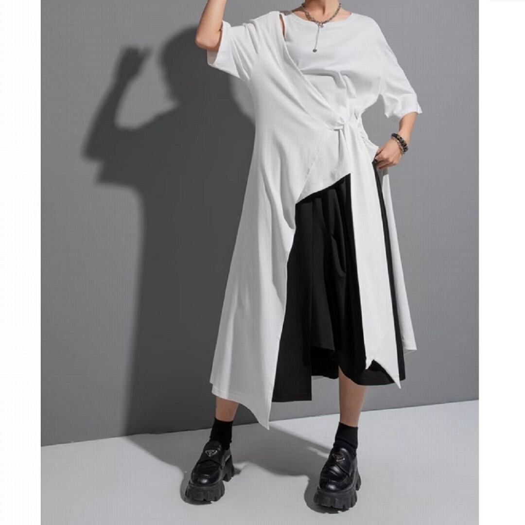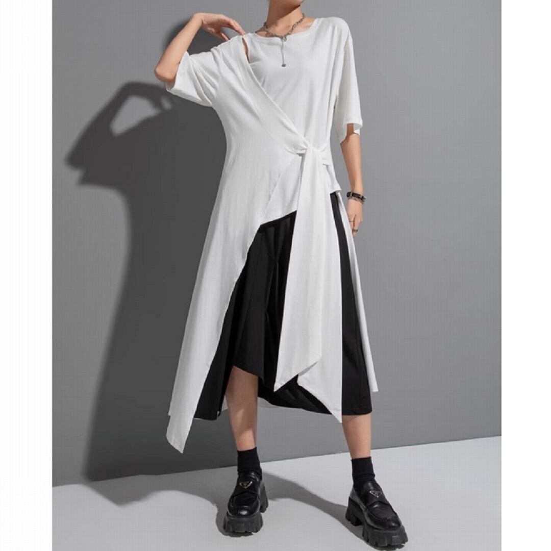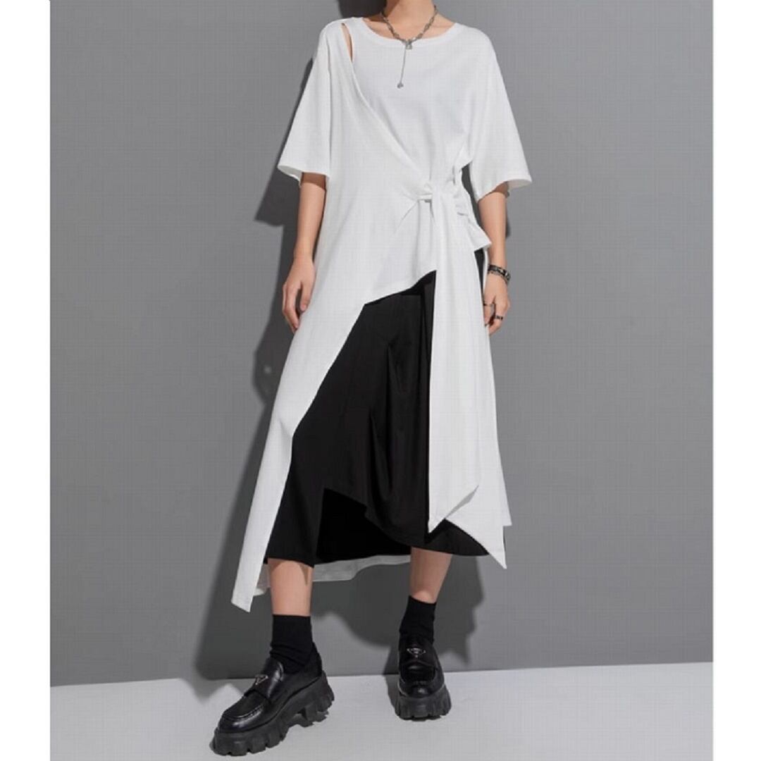 ウエストのリボンデザインが女性らしいシルエットを演出し、カジュアルながらも上品な雰囲気を持っています。