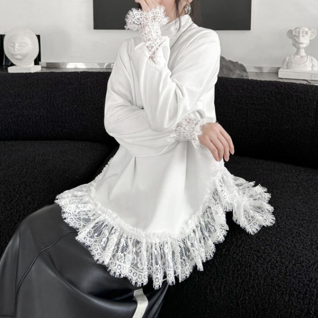 袖口と裾に美しいレースが施されたタートルネックシャツ。