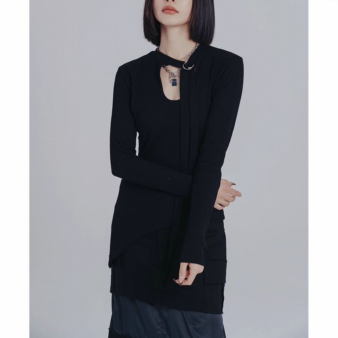 シンプルなデザインながら、大胆な胸元の開きがユニークなアクセント。