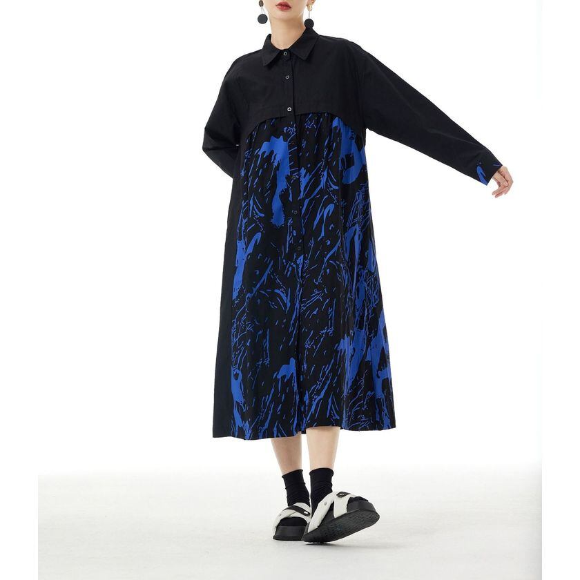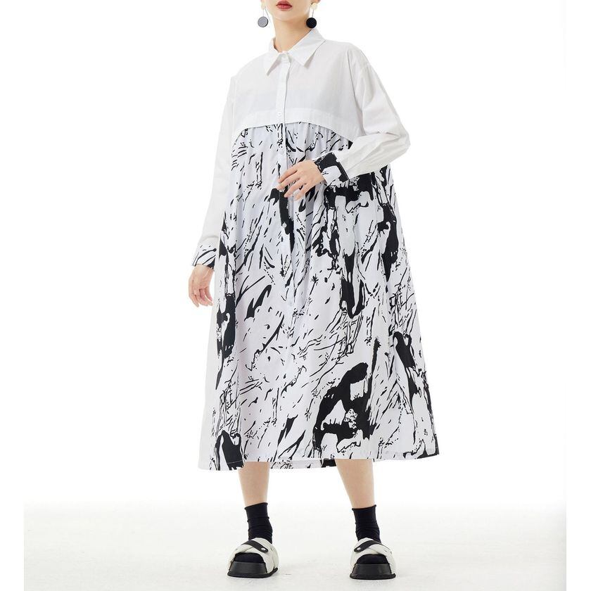 長袖コントラストカラースプライシングプリントドレス 2color ON0631