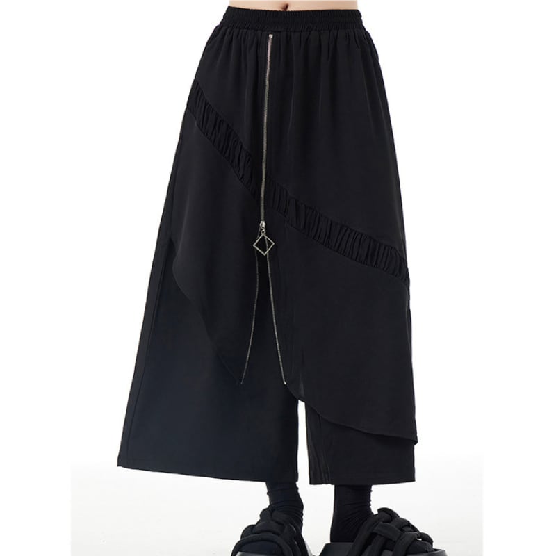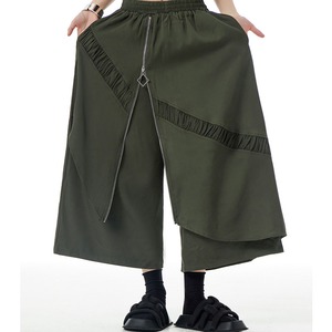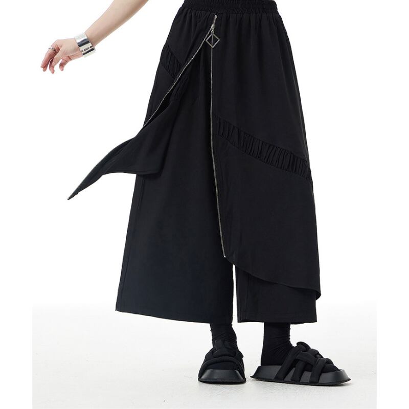 レイヤードデザインにジッパーとギャザーがアクセントのワイドパンツ。