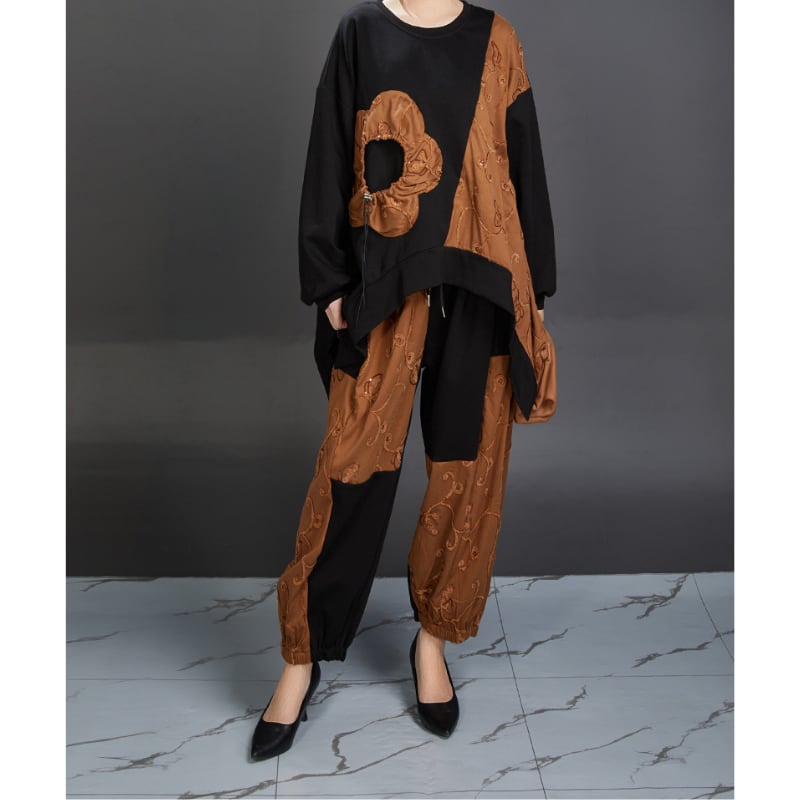 個性的なパッチワークデザインが魅力の長袖トップスとパンツのセットアップ。