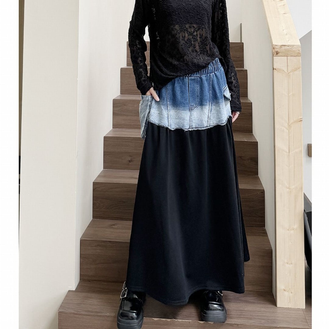 デニムと異素材のコントラストが個性的で、シンプルなトップスと合わせるだけで存在感のあるスタイルが完成します。