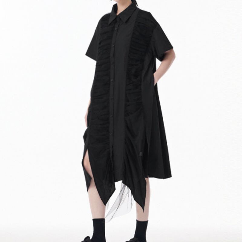 立体的なフリルデザインが特徴的なモードなシャツワンピース。リネンコットンとチュールの組み合わせが独創的な表情を生み出します。美術館巡りやアートギャラリーのオープニングイベントに最適。